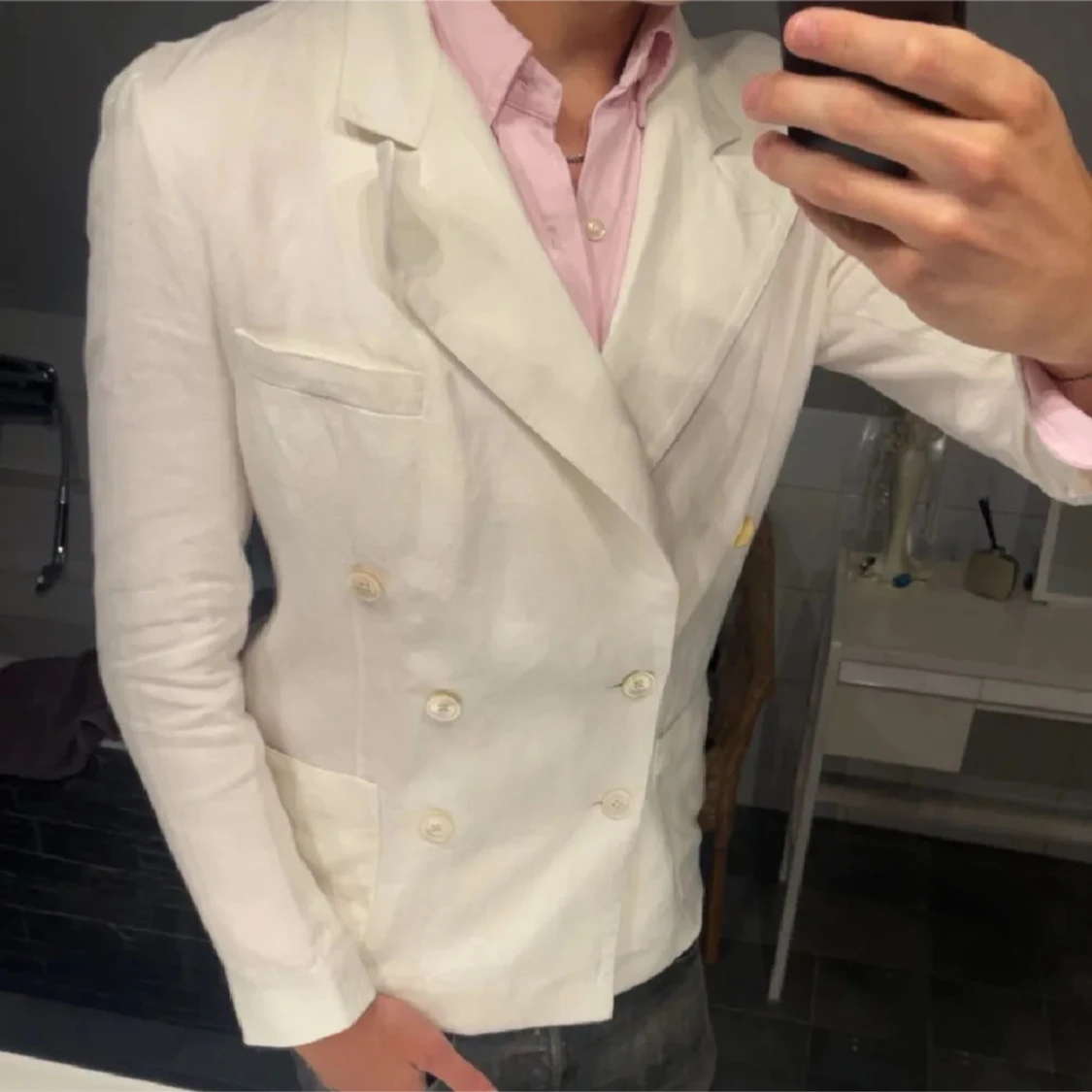 Vit linne Kavaj med dubbelknäppning från Ralph Lauren, kick: 8/10 Storlek: S passar M också. Pris 850kr, nytt pris 4500kr+