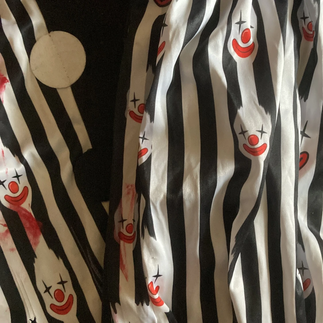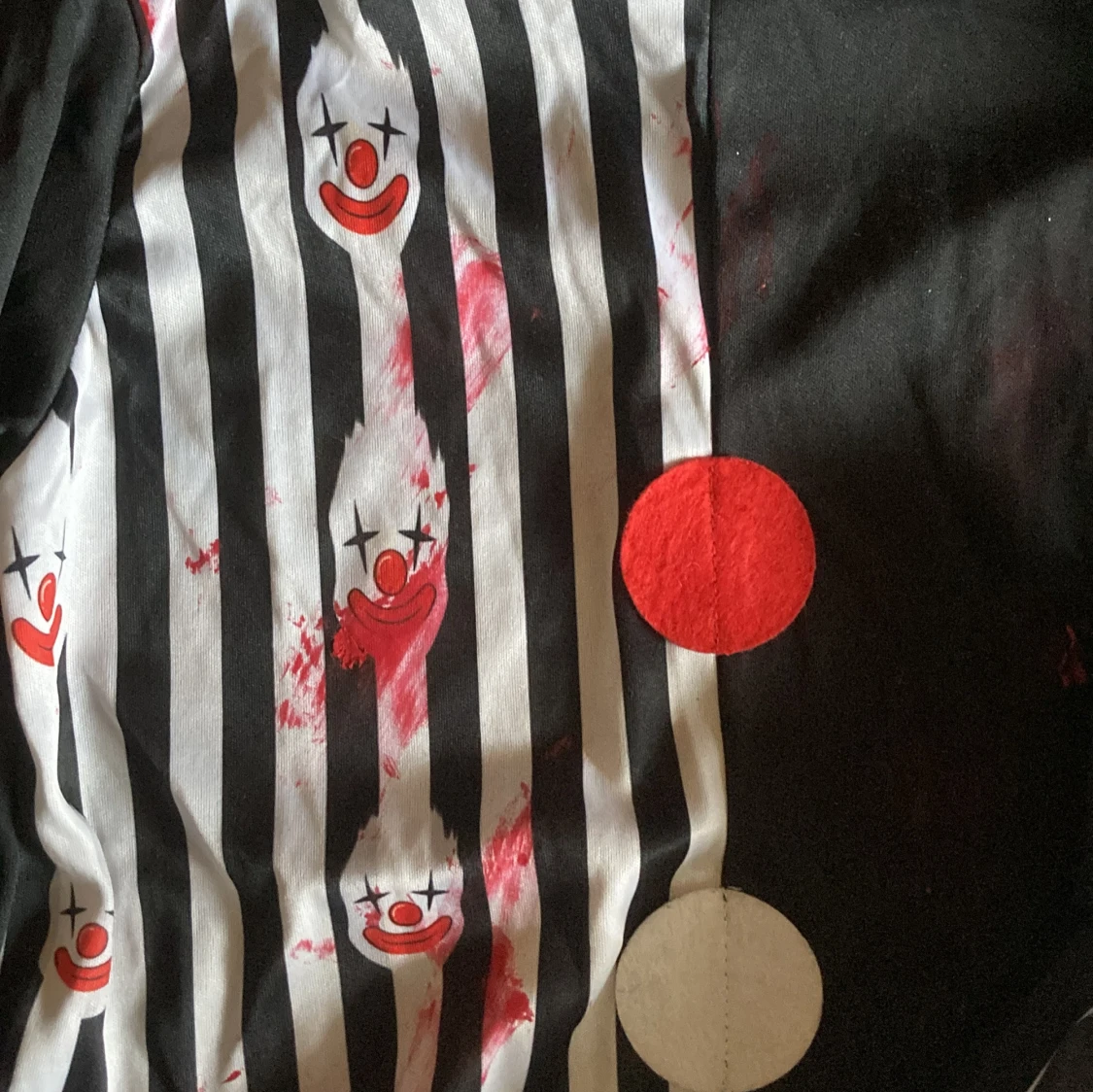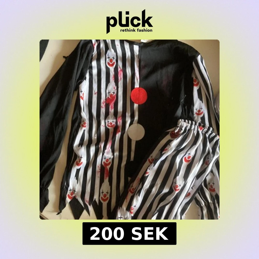 Säljer en clownkostym i svart och vitt med randigt mönster och tryck av röda clownansikten. Kostymen har långa ärmar, elastisk midja på byxorna och två stora cirklar framtill i rött och vitt. Materialet är 100% polyester, perfekt för halloween eller temafest.