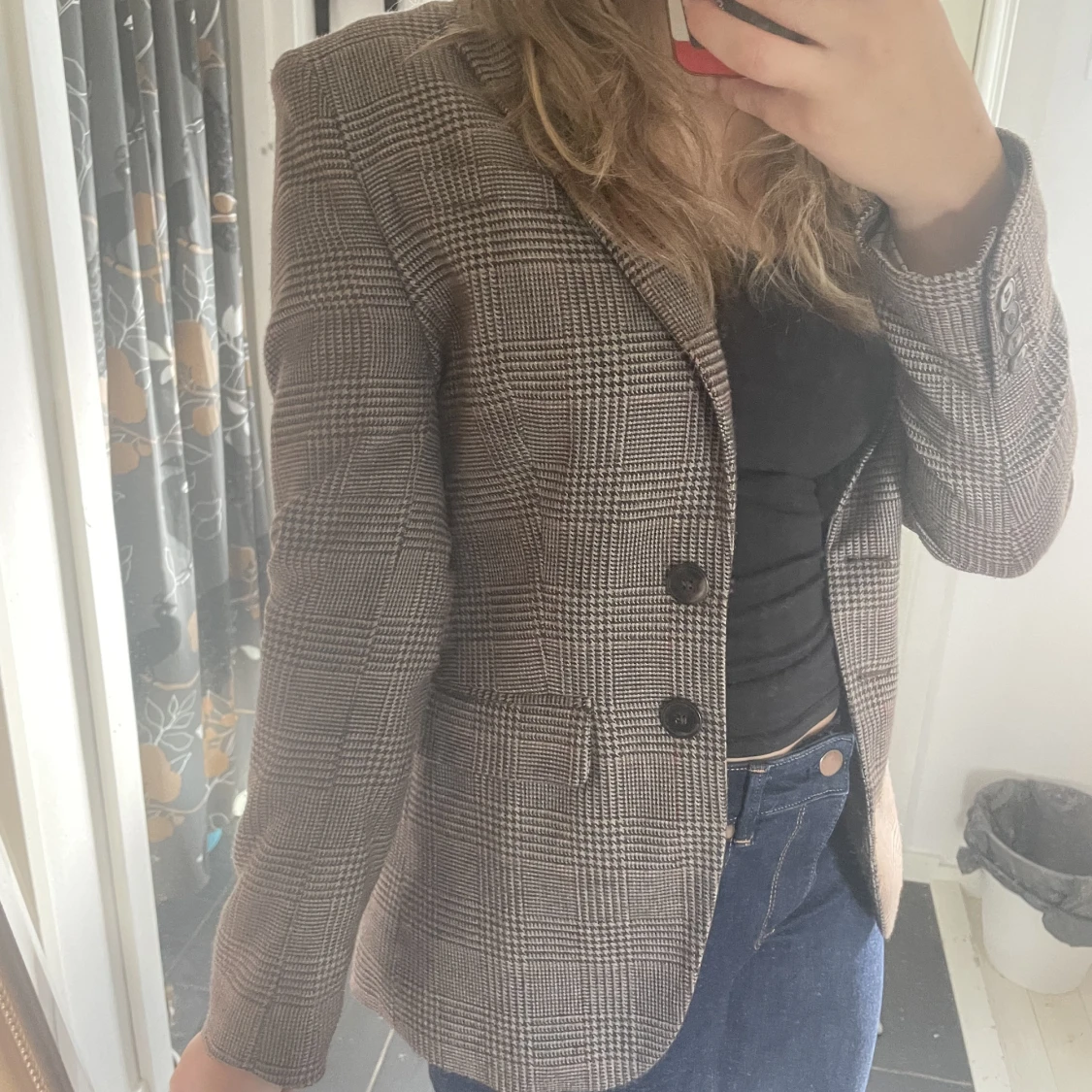 Grå men lite brun kavaj. Bred vid axlarna och svarta detaljer på armbågarna. Skriv för funderingar 😁