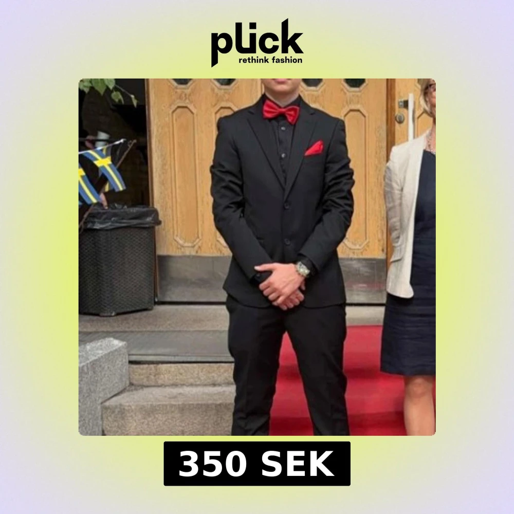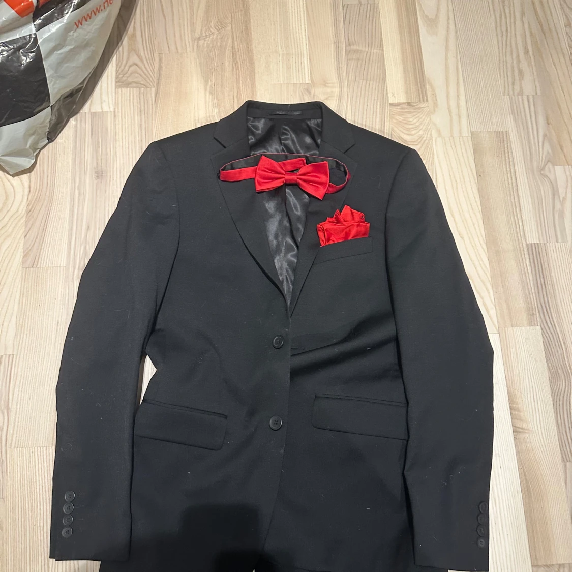 Elegant svart kostym med matchande byxor och kavaj. Inkluderar en röd fluga och näsduk för en stilfull touch. kostymen 44 regular finns även kostym byxor till salu