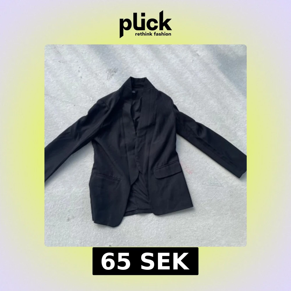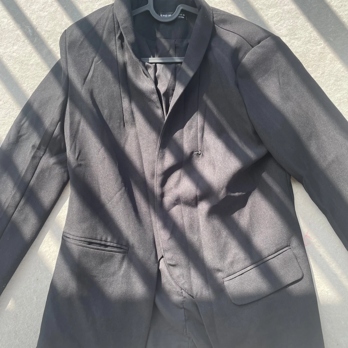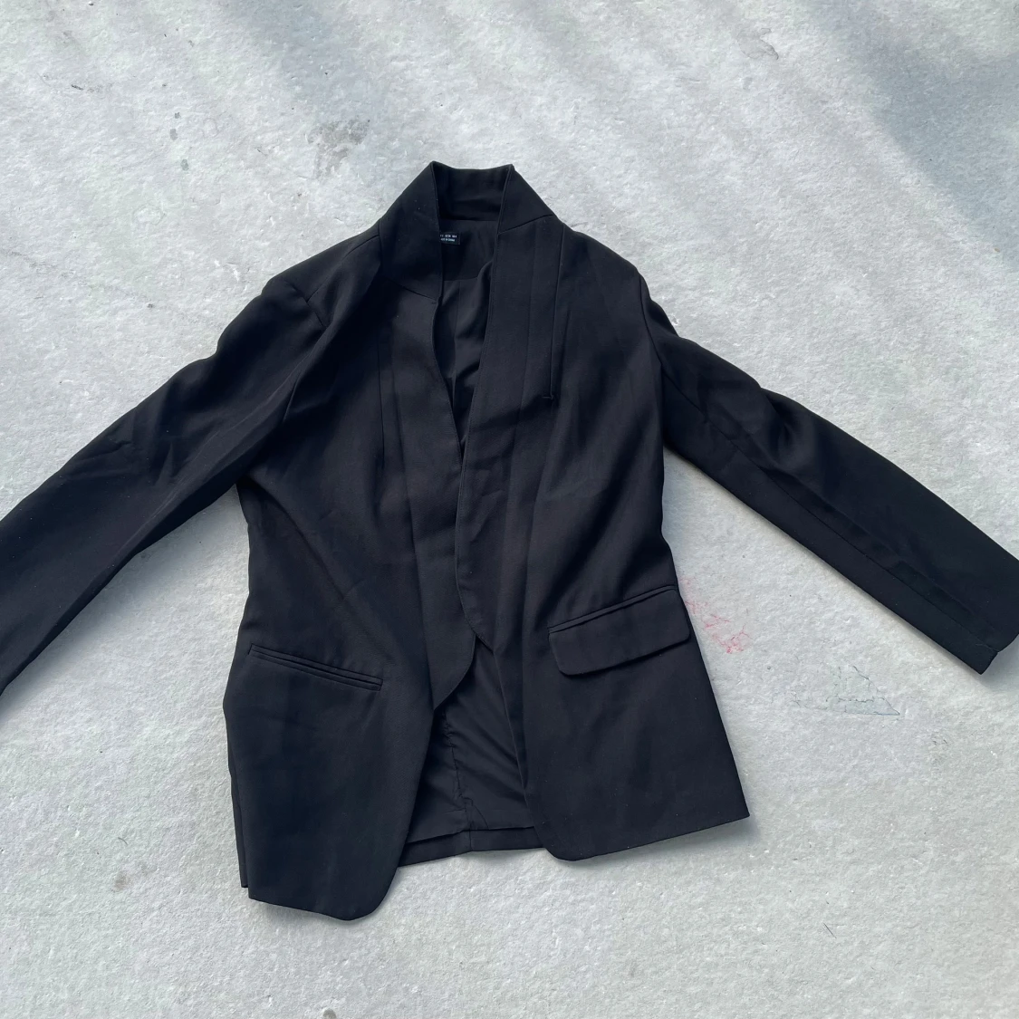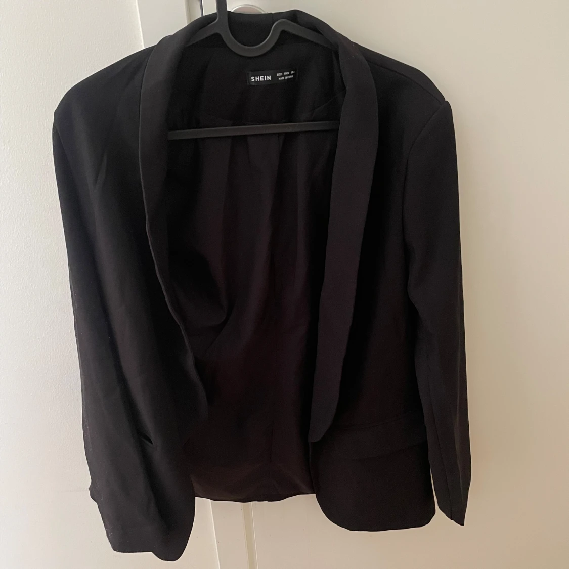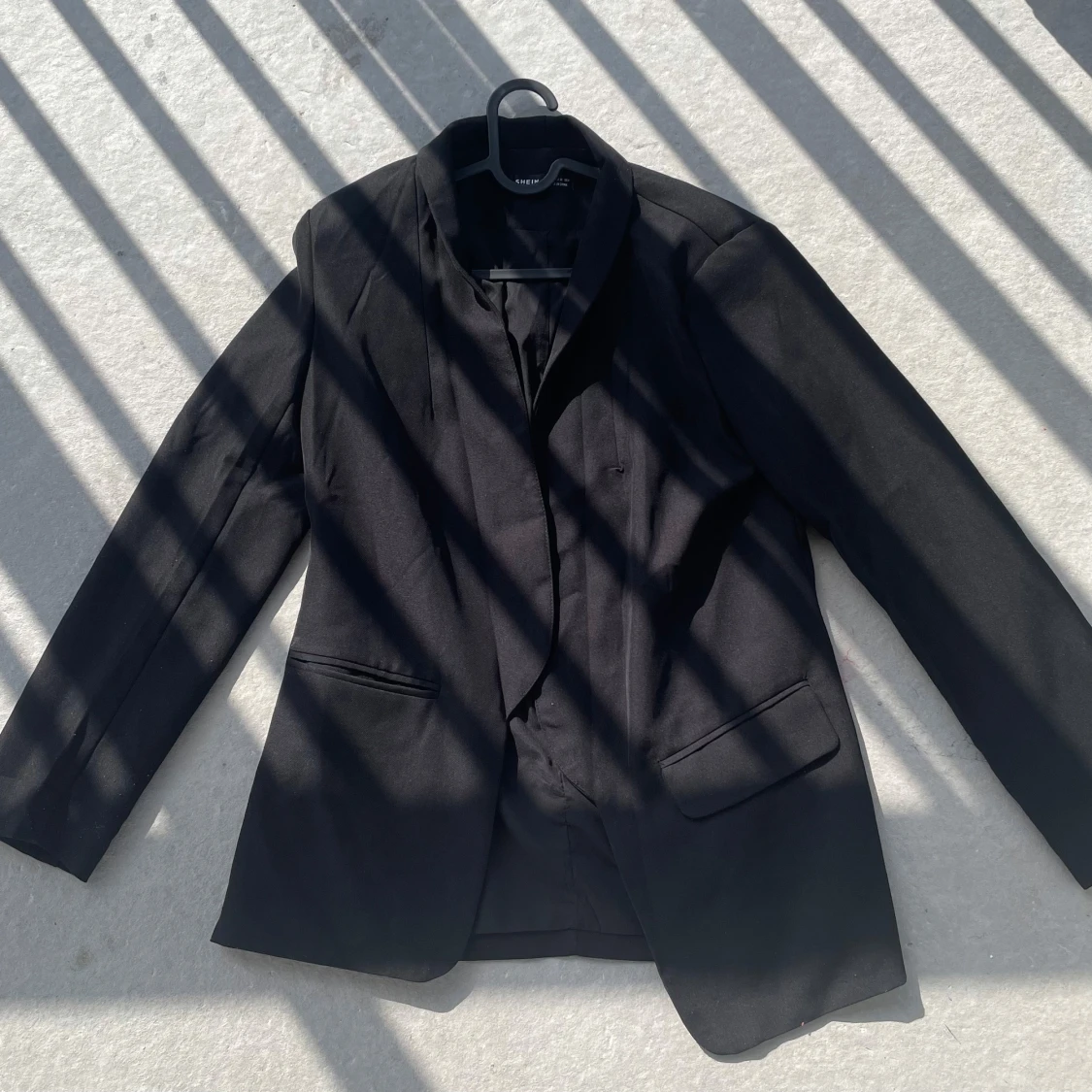 Stilren svart kavaj från SHEIN med klassisk krage och två fickor framtill. Kavajen har en enkel, rak passform och är tillverkad i ett mjukt syntetmaterial. Perfekt för dig som gillar en clean look och vill ha något som funkar till många olika outfits.