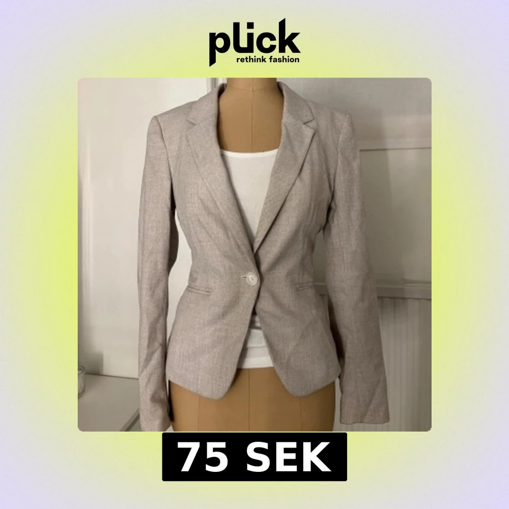 Snygg beige kavaj med klassisk krage och en knapp framtill. Figurnära passform och långa ärmar. Perfekt att styla med en enkel t-shirt eller skjorta för en clean look. Materialet känns lätt och har en diskret struktur.