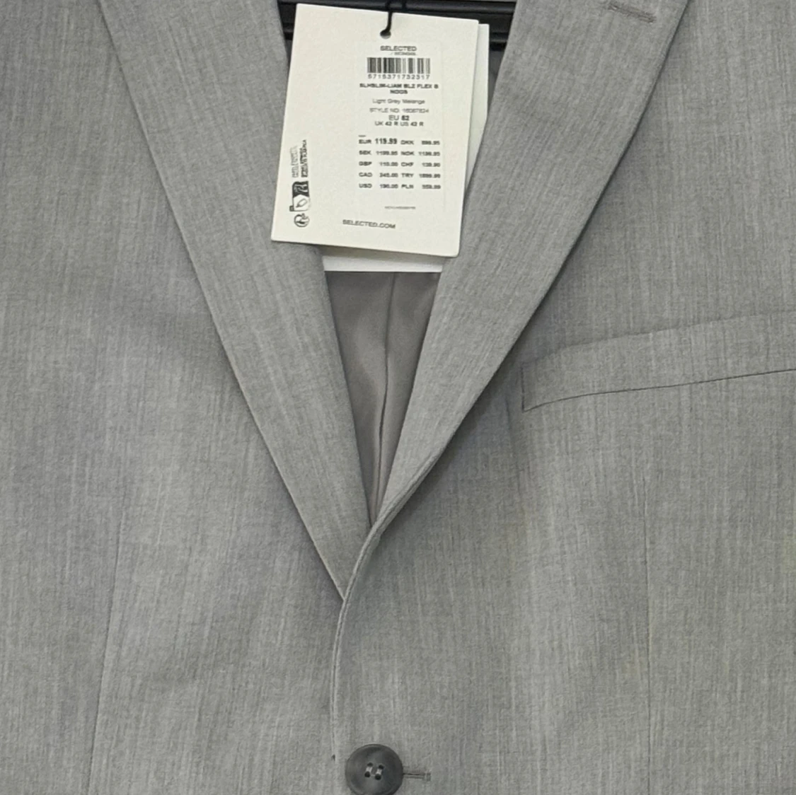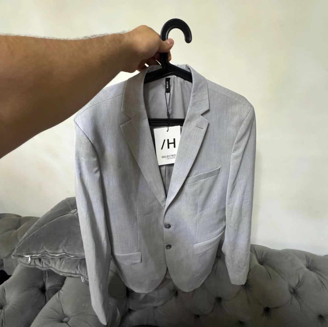 Snygg ljusgrå kavaj från Selected Homme med klassisk passform och två knappar framtill. Kavajen har diskreta fickor och stilren krage, perfekt för dig som gillar en clean och modern look. Materialet är mjukt och lätt, vilket gör den bekväm att bära.