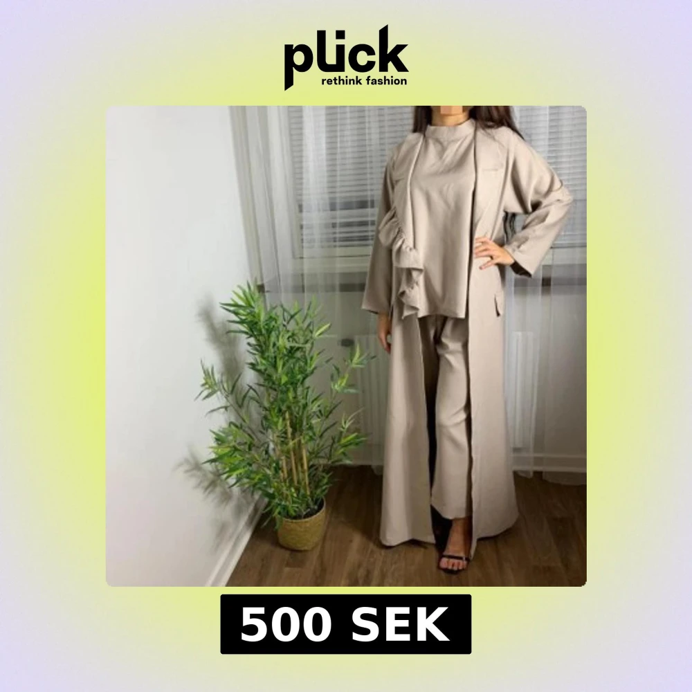 Snyggt beige set med en lång kappa och matchande byxor. Kappan har en knytning framtill och vida ärmar. Byxorna är vida och bekväma, perfekt för en stilren look. Passar bra till både vardag och speciella tillfällen. Oanvänd finns olika storlekar. Finns i storlek S-L ingår en slöja med