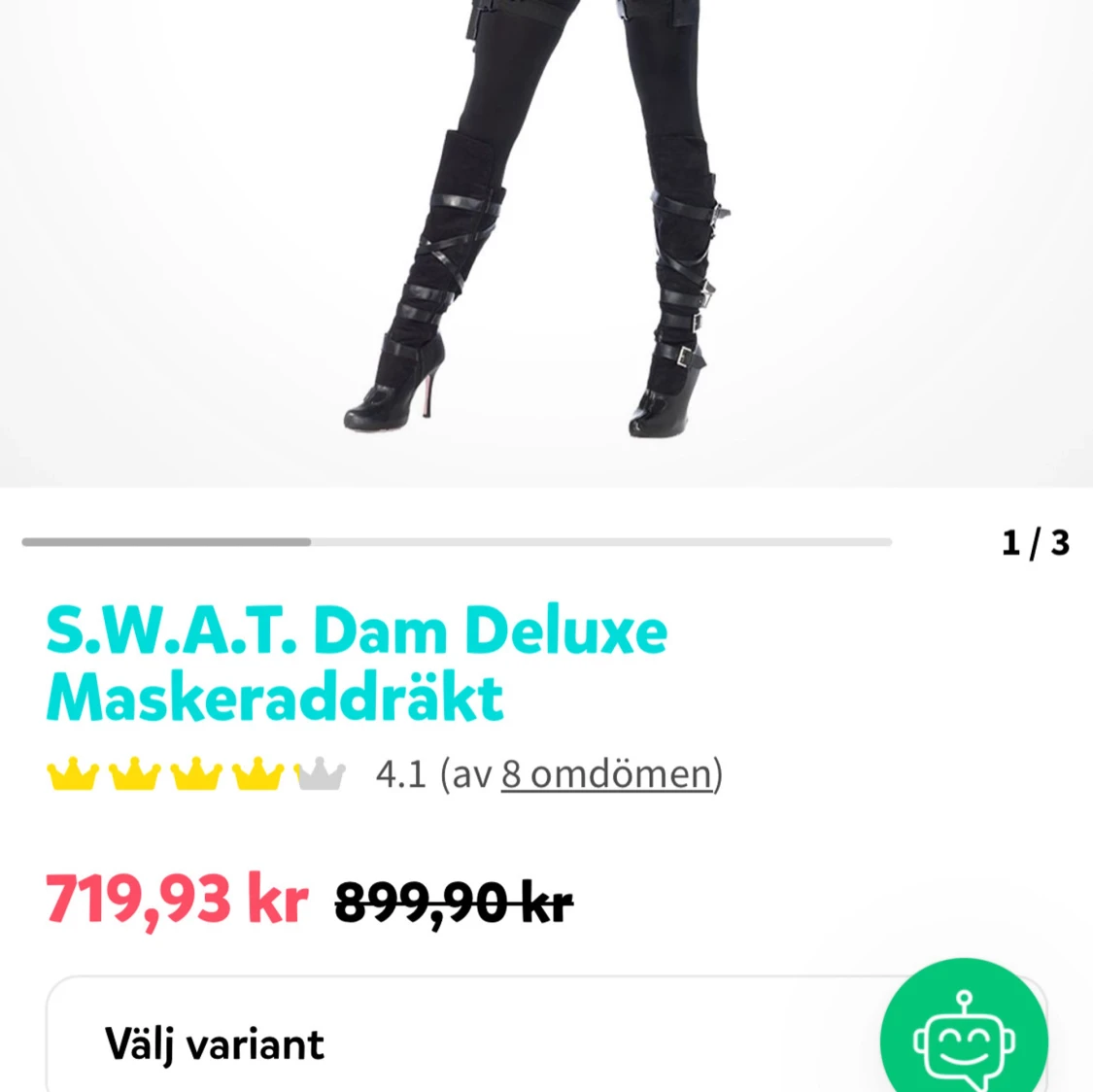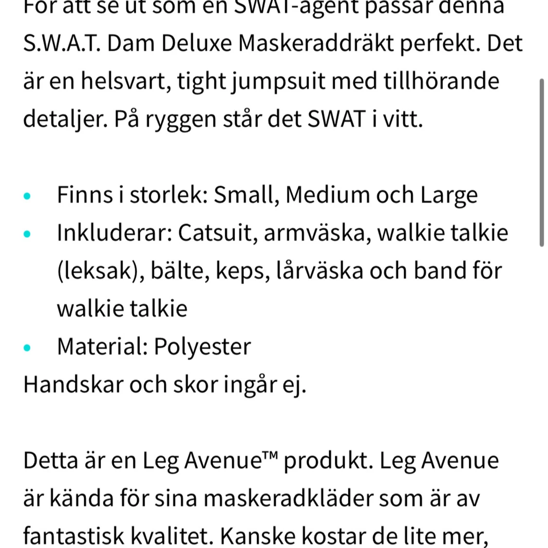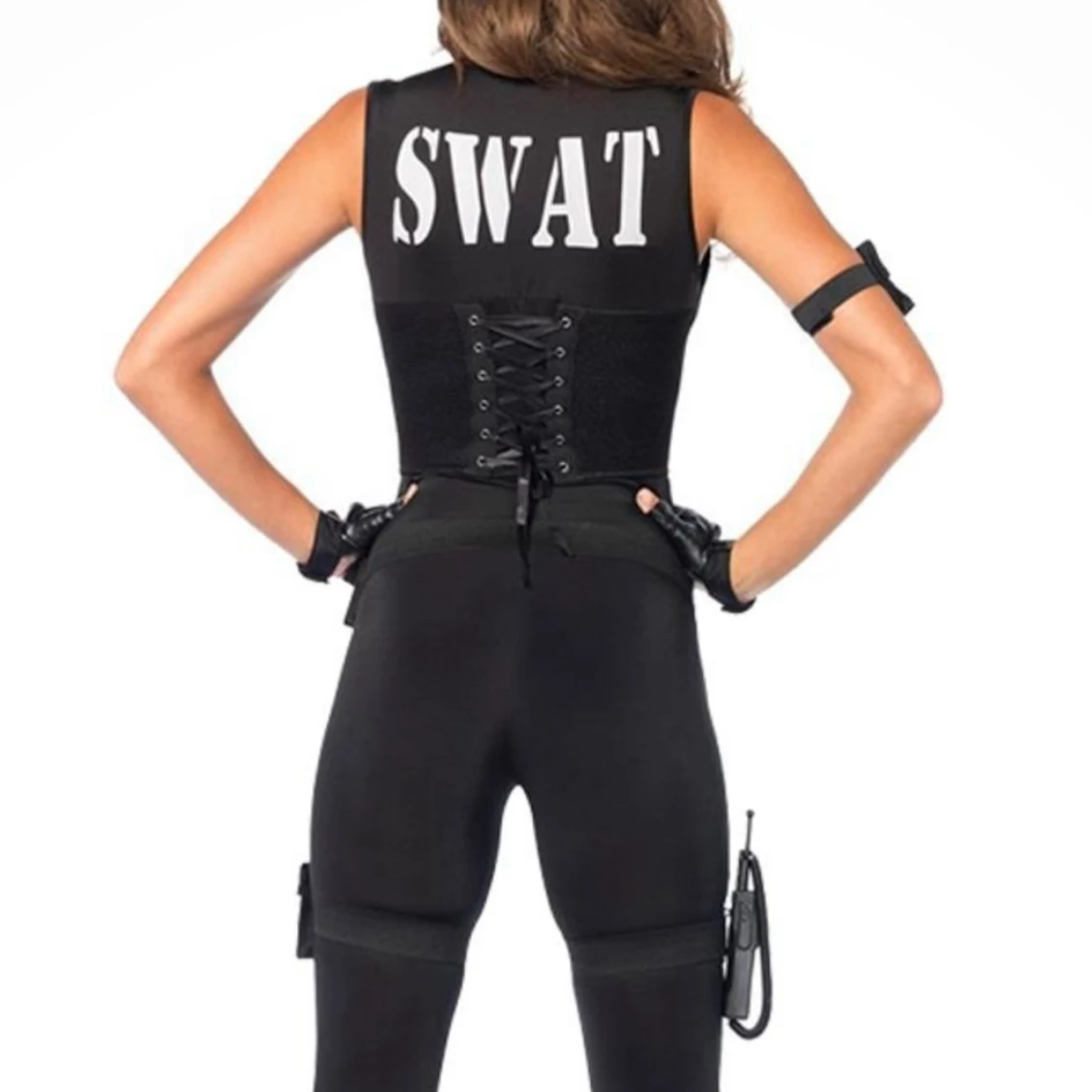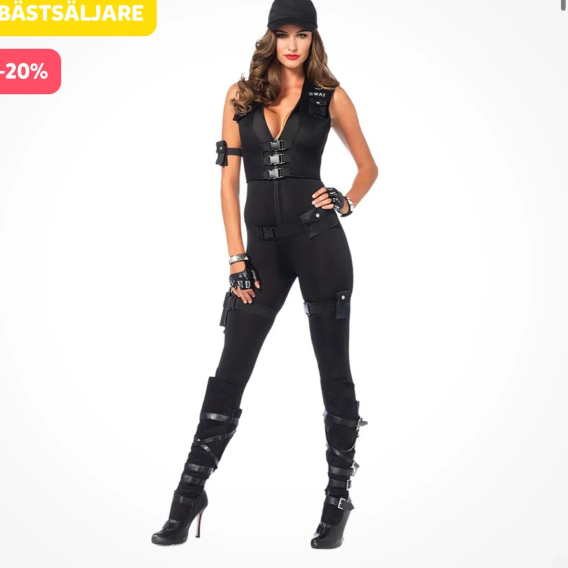 Snygg svart S.W.A.T. maskeraddräkt för dam med tight passform, v-ringad topp och coola spänndetaljer. Däremot har jag tappa bort lite tillbehör då sist jag använde den var förra halloween. Det som finns är radion och ena spännbandet på högra låret. Kan postats redan idag!