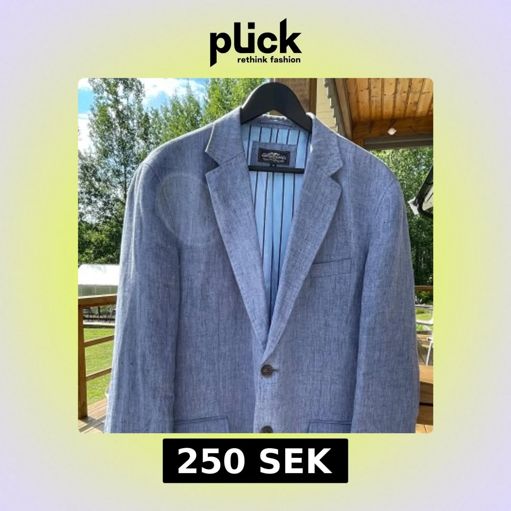 Snygg blå kavaj från Hampton Republic i storlek 56. Tillverkad i linne med klassisk passform, två knappar framtill och flera fickor. Insidan har ett stilrent blått foder med svarta ränder. Perfekt för en fräsch och avslappnad look.