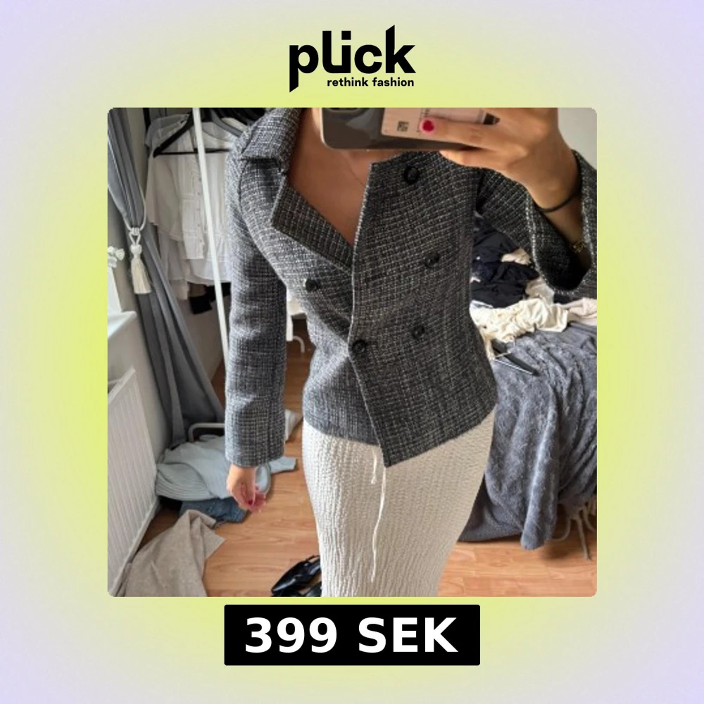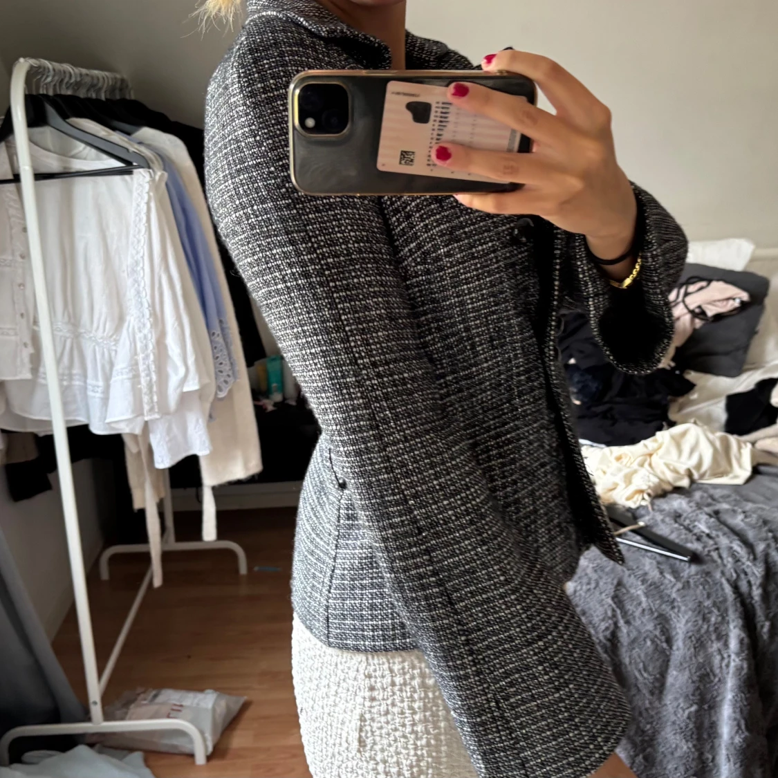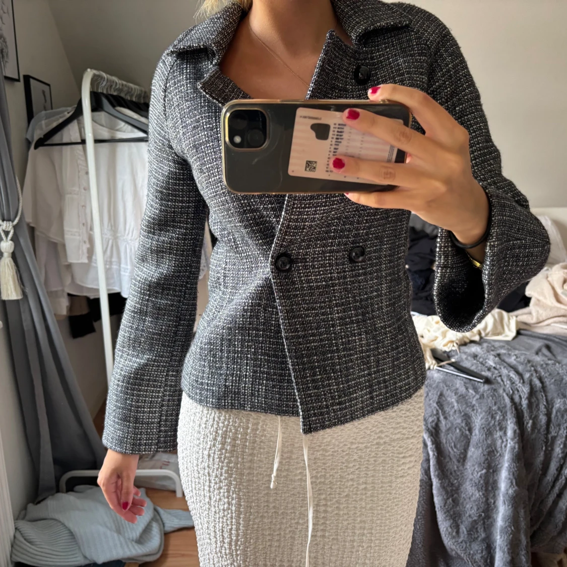 Säljer en stilren grå kavaj med dubbelknäppning och klassisk krage. Jackan har ett diskret rutigt mönster och är figursydd med långa ärmar. Perfekt för dig som vill ha en snygg och tidlös look.