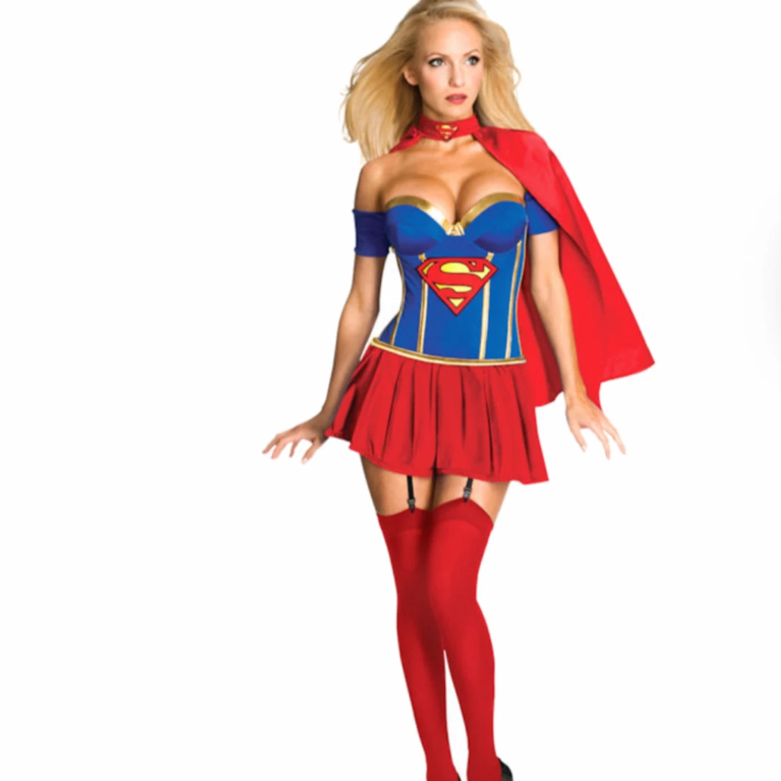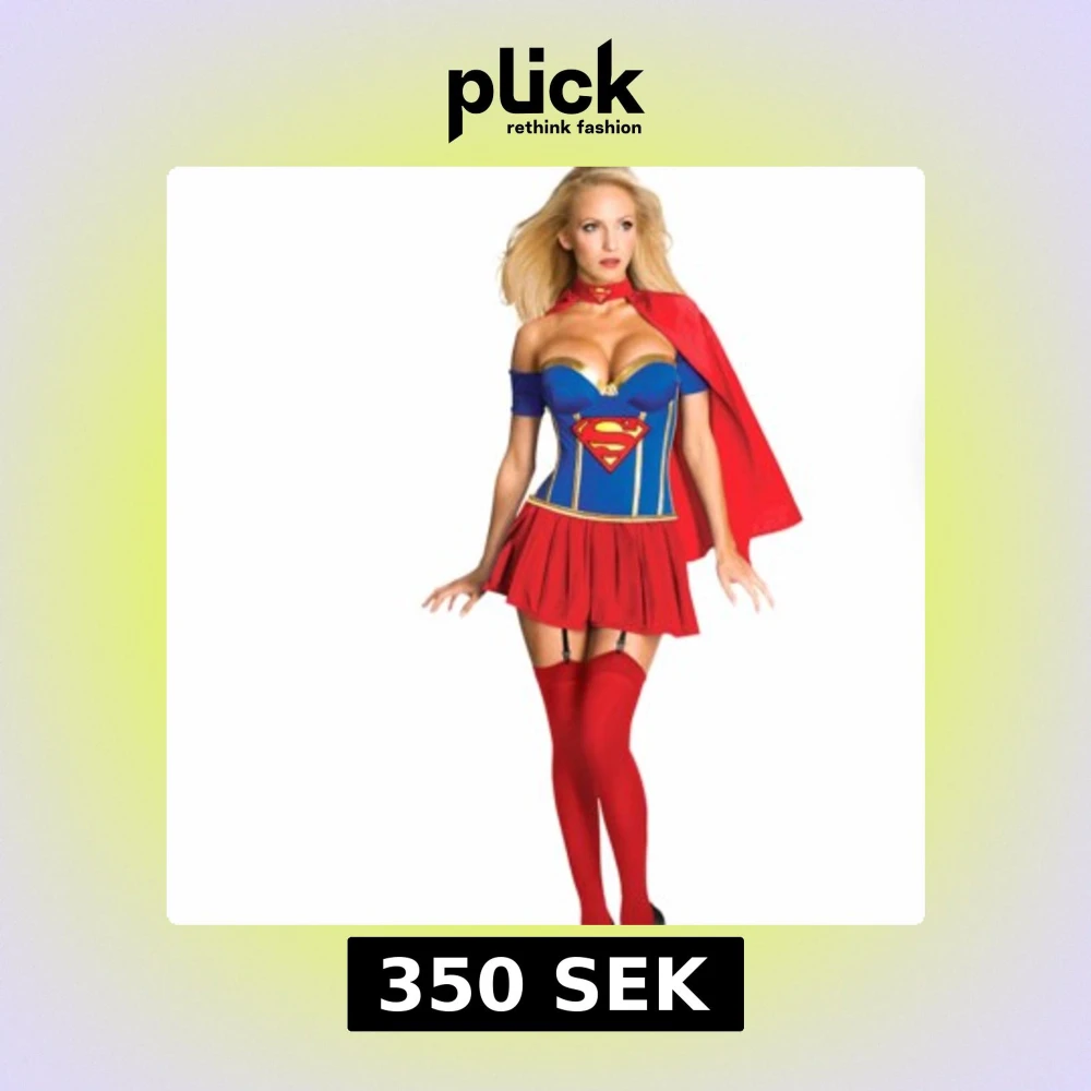 Säljer superwoman kostym, endast använd en gång. Kommer med kjol, cape, korsett, fästen till stay ups, samt genomskinliga band som håller upp korsetten. Storlek L men är insydd så den passar S/M