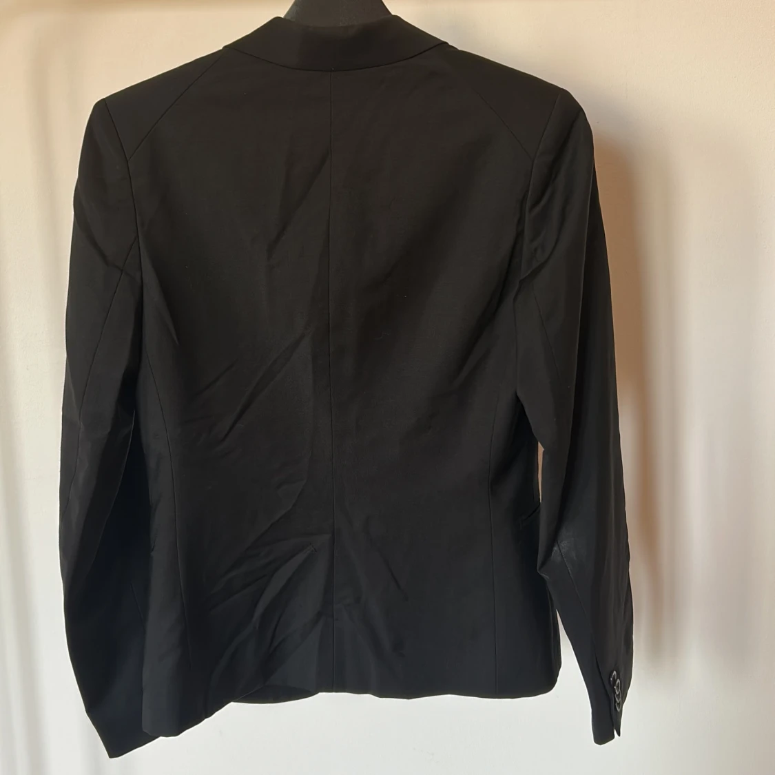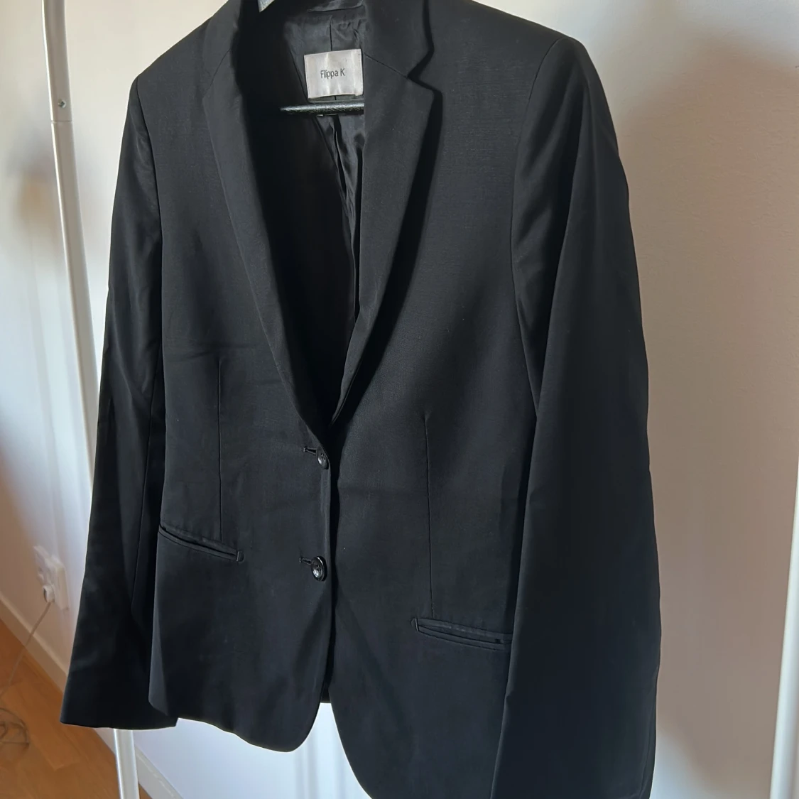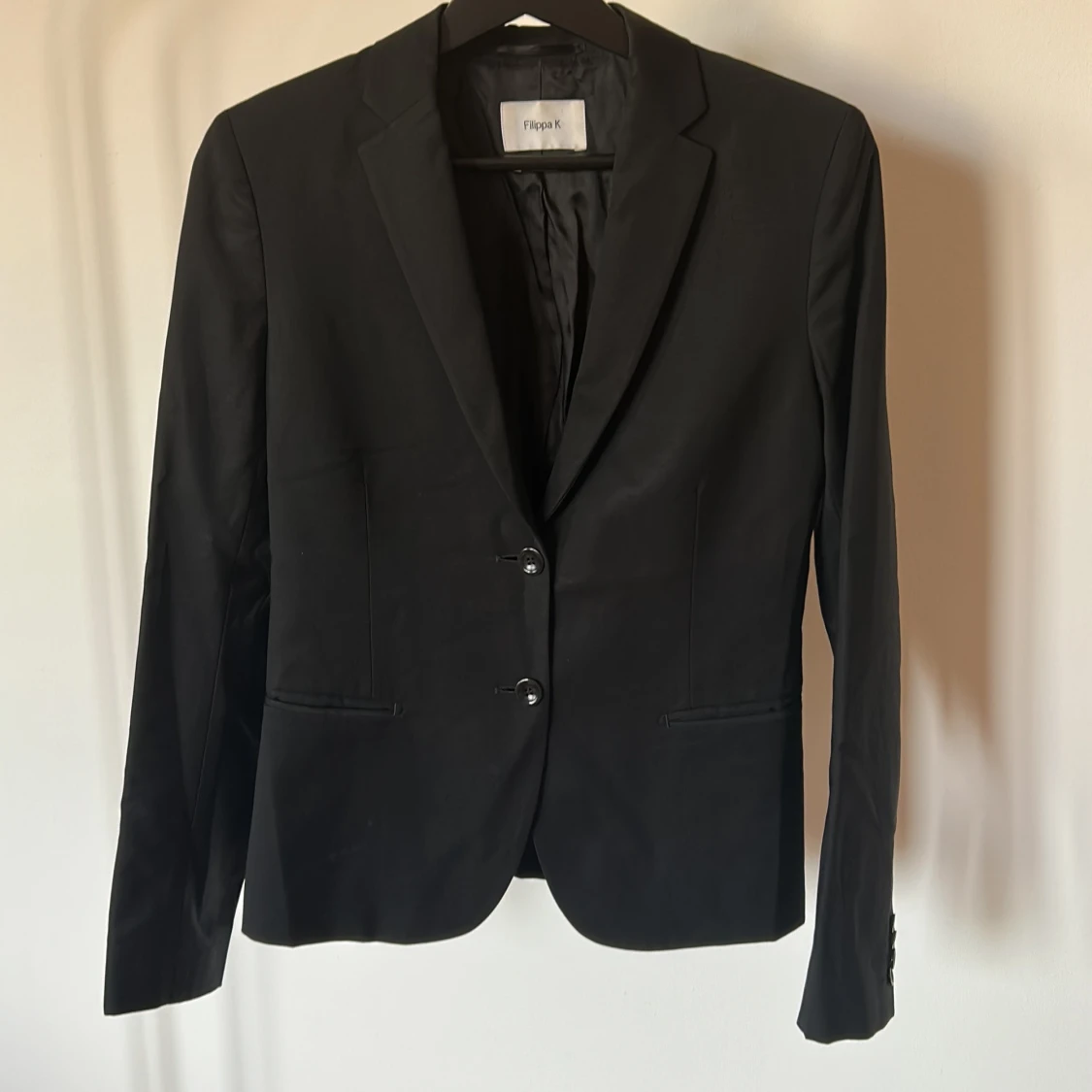 Stilren svart kavaj från Filippa K med klassisk krage och två knappar framtill. Storlek S i ull. I modellen Jackie.