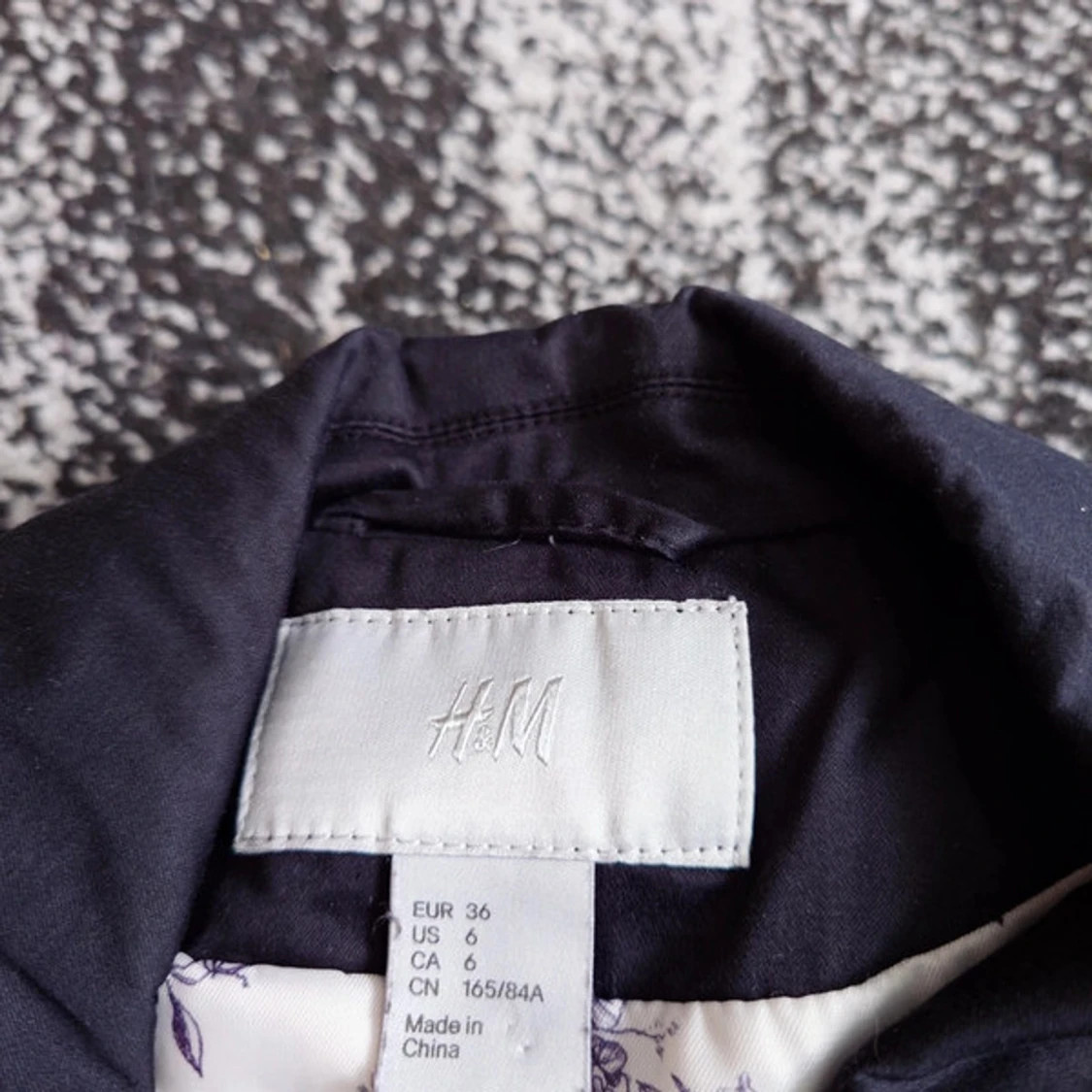 Stilren svart kavaj från H&M i storlek 36. Klassisk modell med krage, knappstängning och två fickor framtill. Fodret har ett diskret blommigt mönster i vitt och lila.