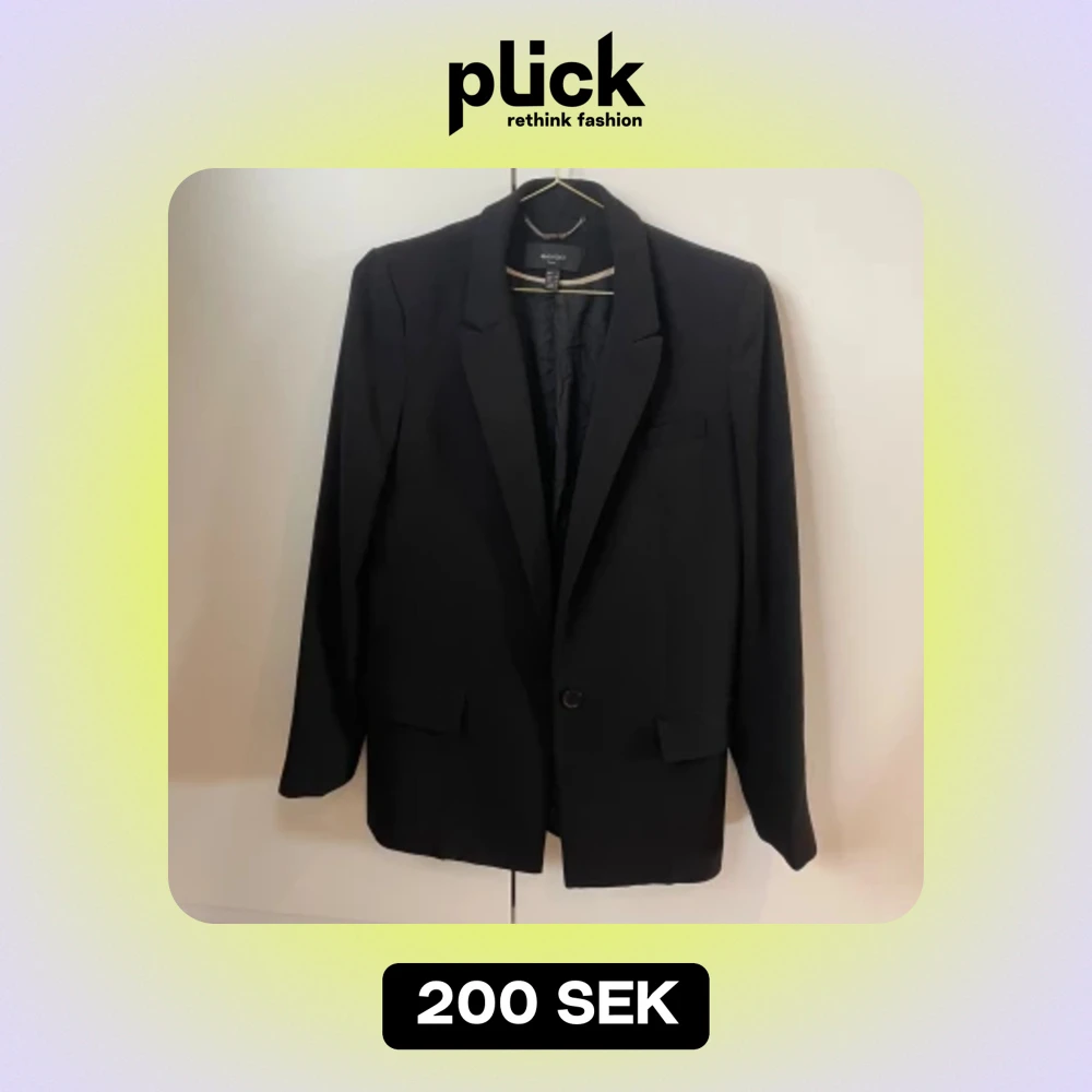 Säljer en stilren svart kavaj från Mango i storlek S. Kavajen har en klassisk design med en knapp framtill och fickor på sidorna. Perfekt för både formella och semi-formella tillfällen. Den är i bra skick och redo att användas direkt. Passar perfekt till höst- och vårsäsongen.