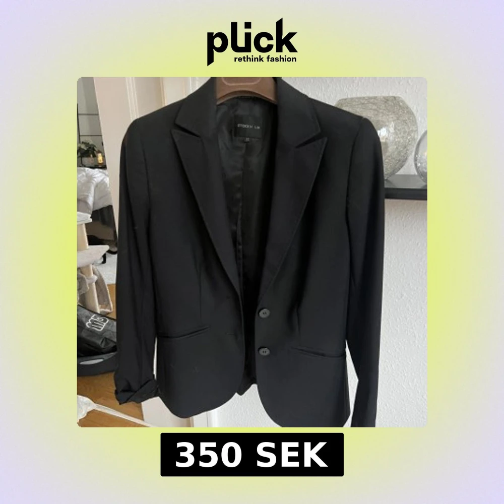Klassisk svart kavaj från STOCKH LM i storlek 32. Kavajen har två knappar framtill, smala slag och fickor med lock. Materialet är en mix av ull, polyester och elastan för en bekväm passform. Perfekt för en stilren och tidlös look.