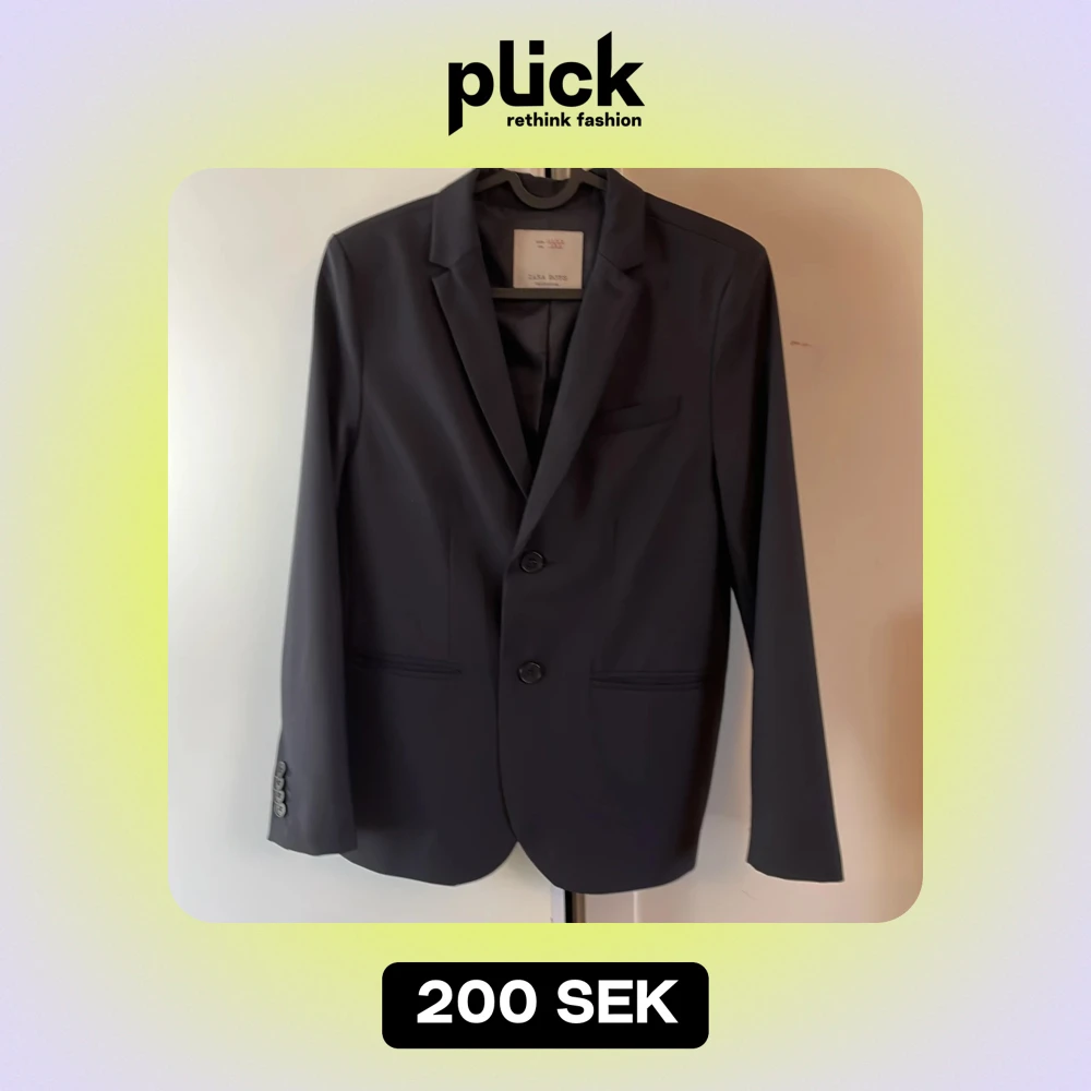 Snygg svart kavaj från Zara Boys i storlek 152, perfekt för festliga tillfällen. Kavajen har en klassisk design med två knappar fram och fickor på sidorna. Tillverkad i Bulgarien, den är i nytt skick och redo att bäras till nästa stora event!