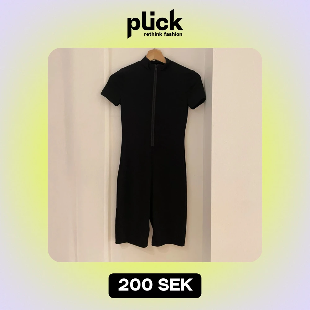 Snygg och stilren svart jumpsuit med korta ärmar och dragkedja framtill. Perfekt för en minimalistisk look, passar både till vardags och festligare tillfällen. Materialet ser ut att vara stretchigt och bekvämt.