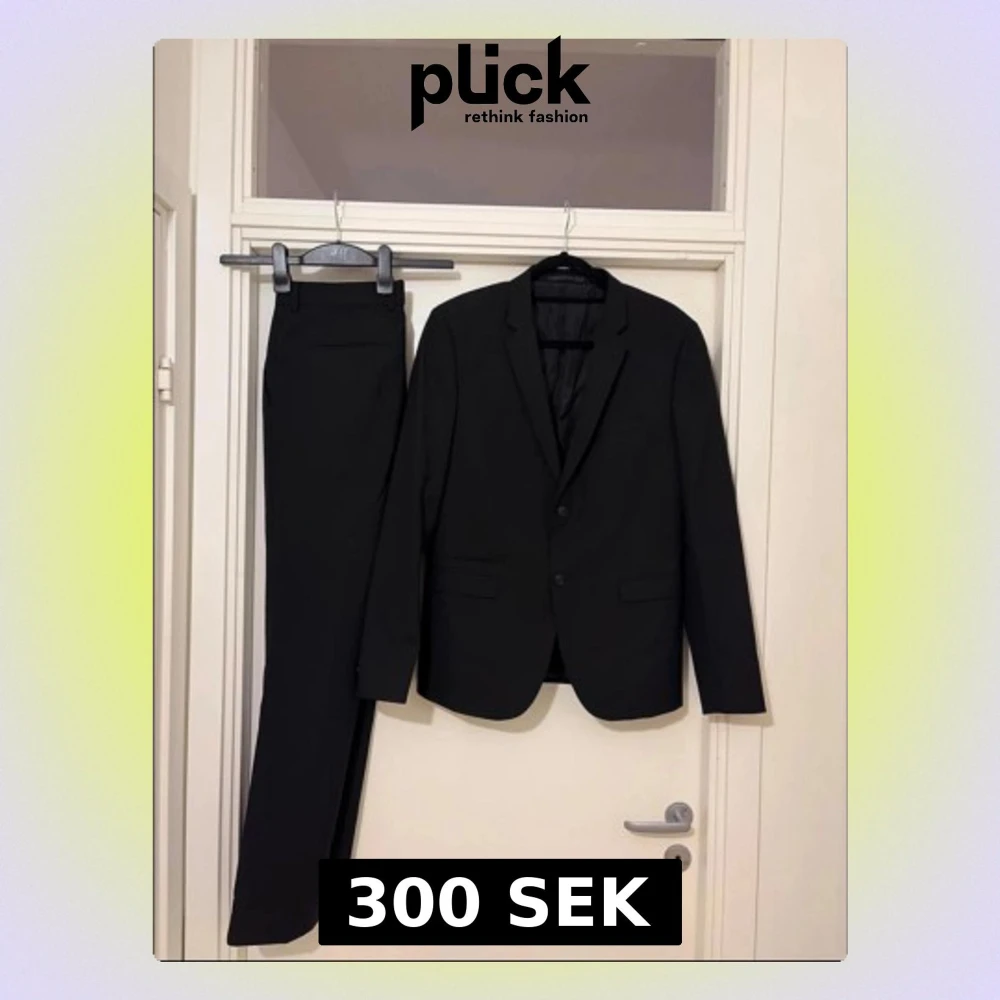 Snygg svart kostym från Bläck med slim fit passform. Kavajen har klassisk design med två knappar och fickor fram, och byxorna är raka och stilrena. Materialet är polyester och kostymen har diskret mönstrat foder.