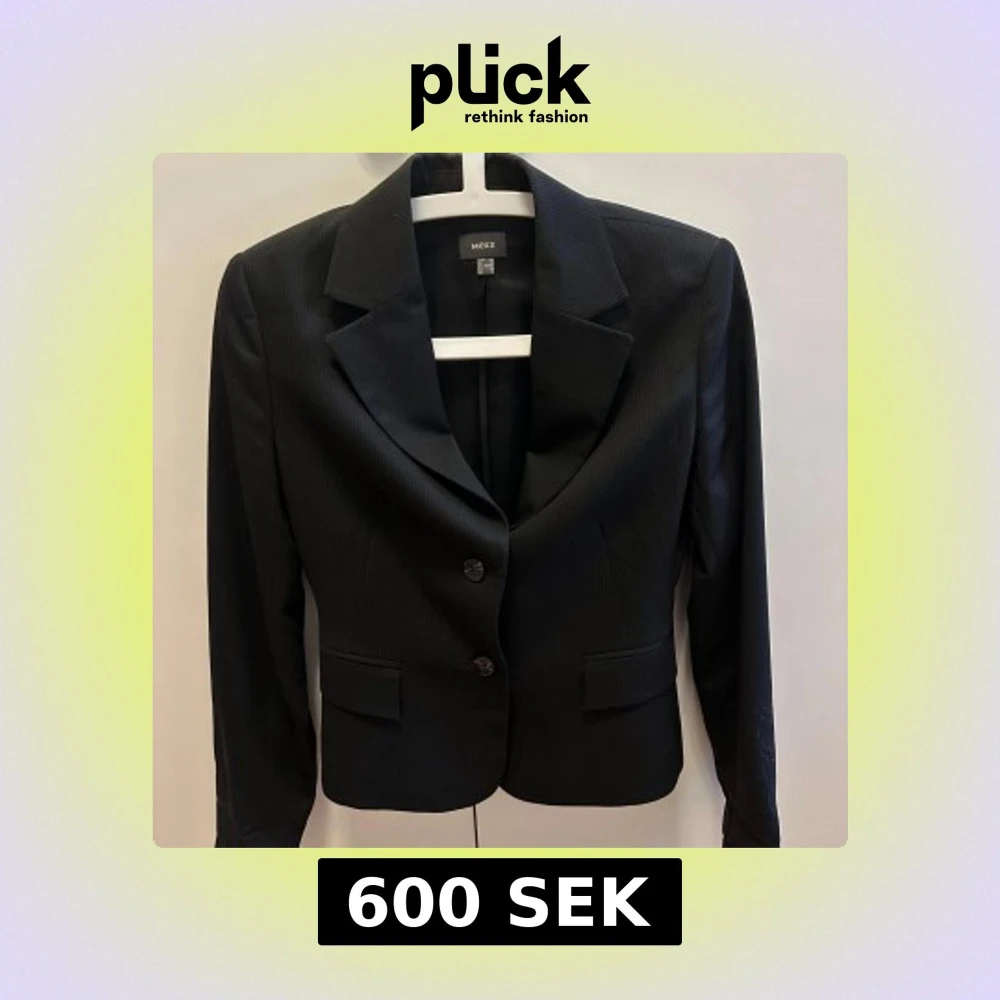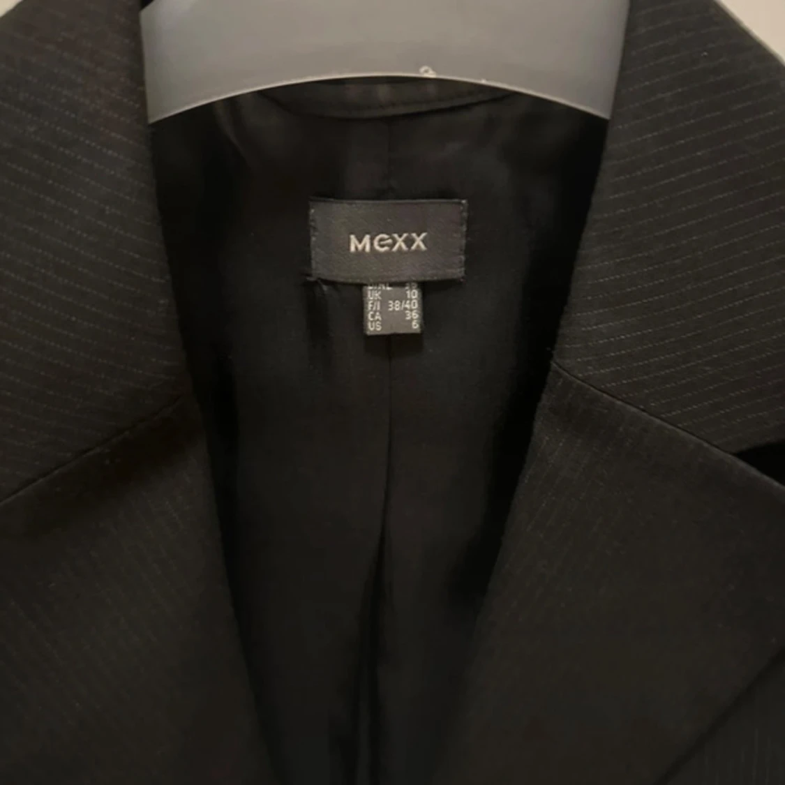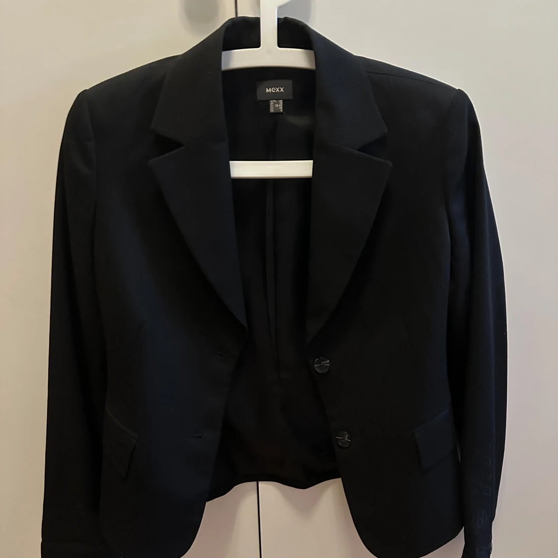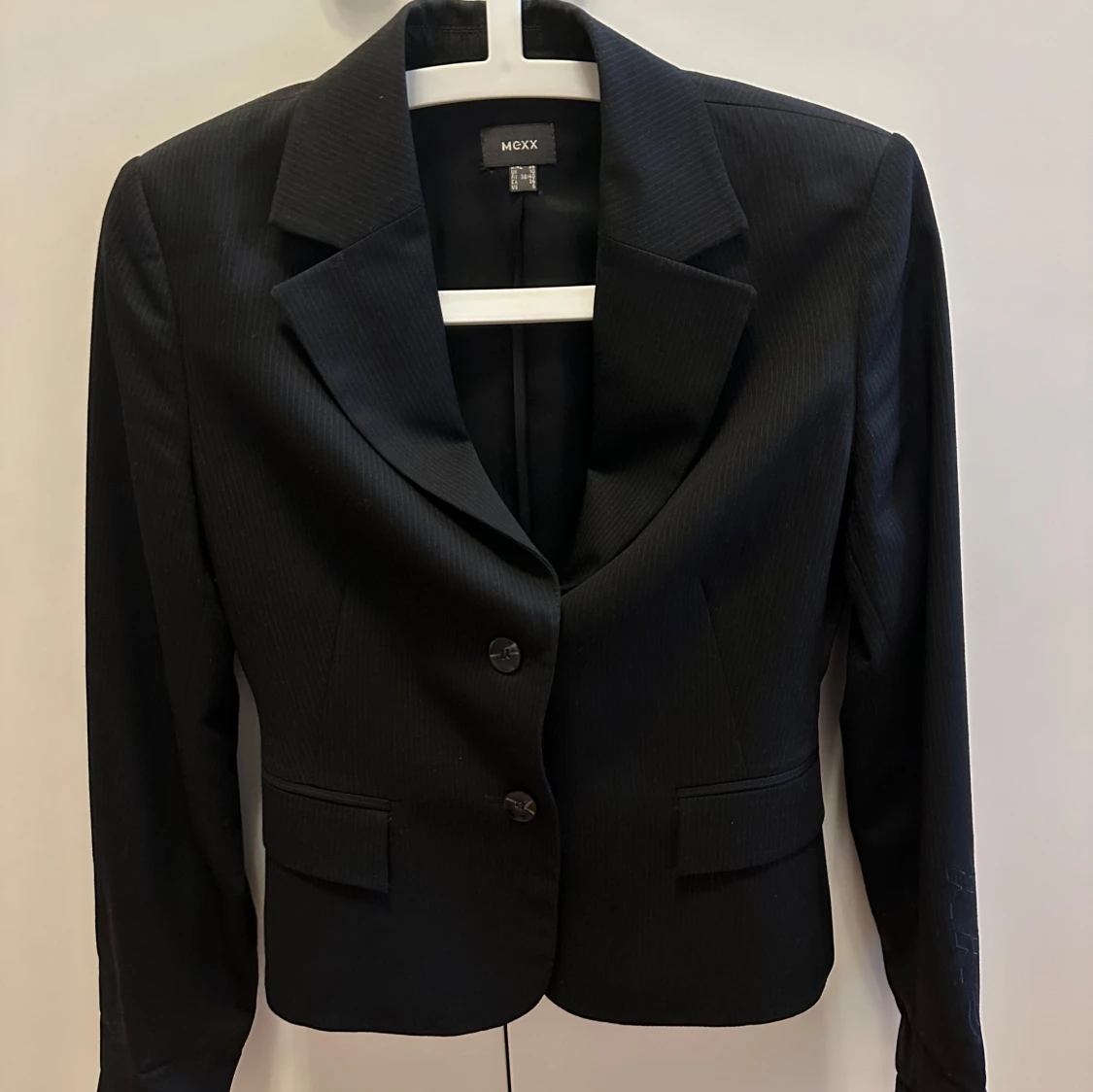 Snygg svart kavaj från Mexx med diskreta tunna ränder. Klassisk modell med två knappar framtill, spetsiga slag och två fickor med lock. Perfekt för dig som gillar stilrena och tidlösa plagg