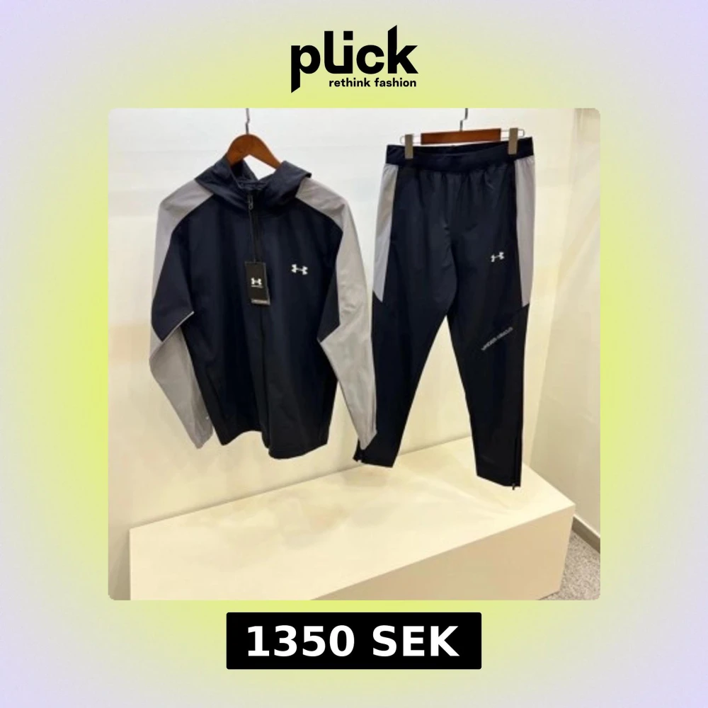 Snyggt träningsset från Under Armour med svart jacka och byxor, båda med grå paneler på sidorna. Jackan har huva och dragkedja framtill, och byxorna har logga på benet. Perfekt för dig som gillar sportig stil och vill ha något bekvämt till gymmet.