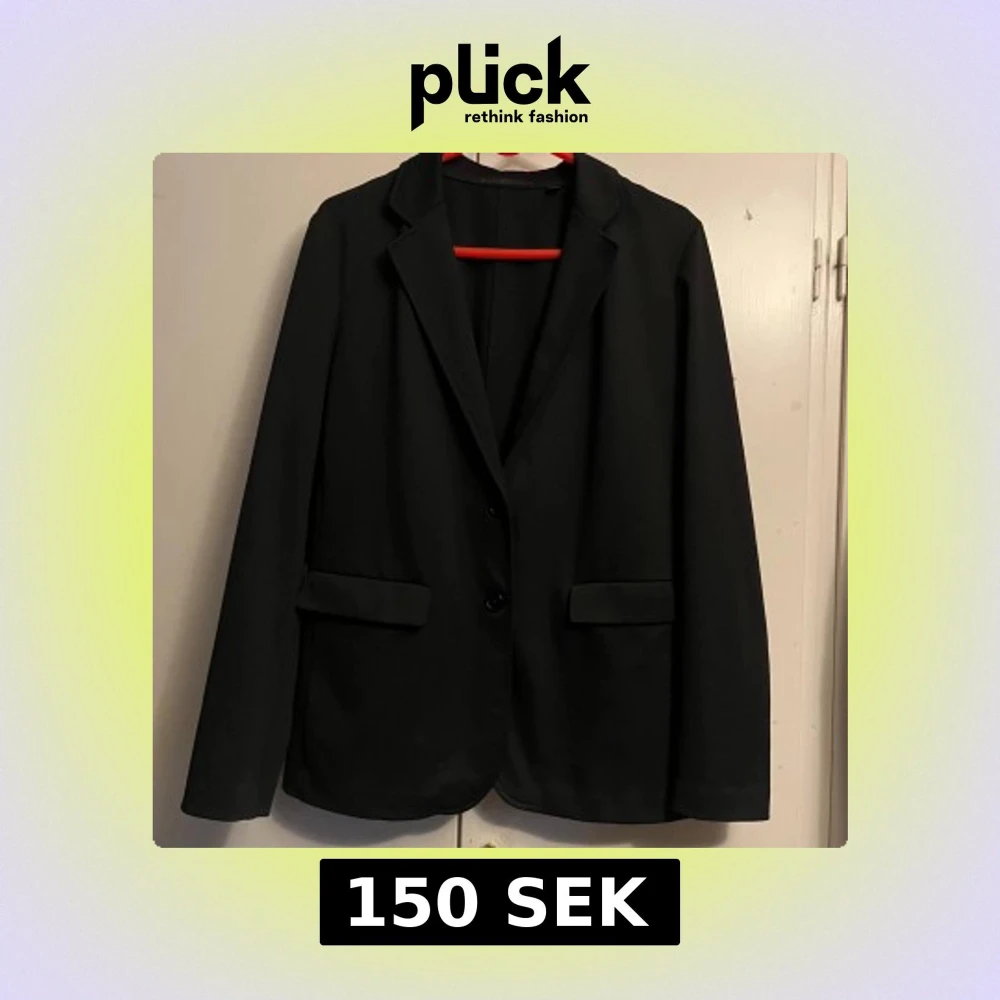 Stilren svart kavaj från Uniqlo med klassisk krage och två knappar framtill. Kavajen har raka ärmar, två fickor och är tillverkad i en mix av polyester, lyocell och elastan för en bekväm passform. Köpte den för några år sedan men har bara använt några gånger.
