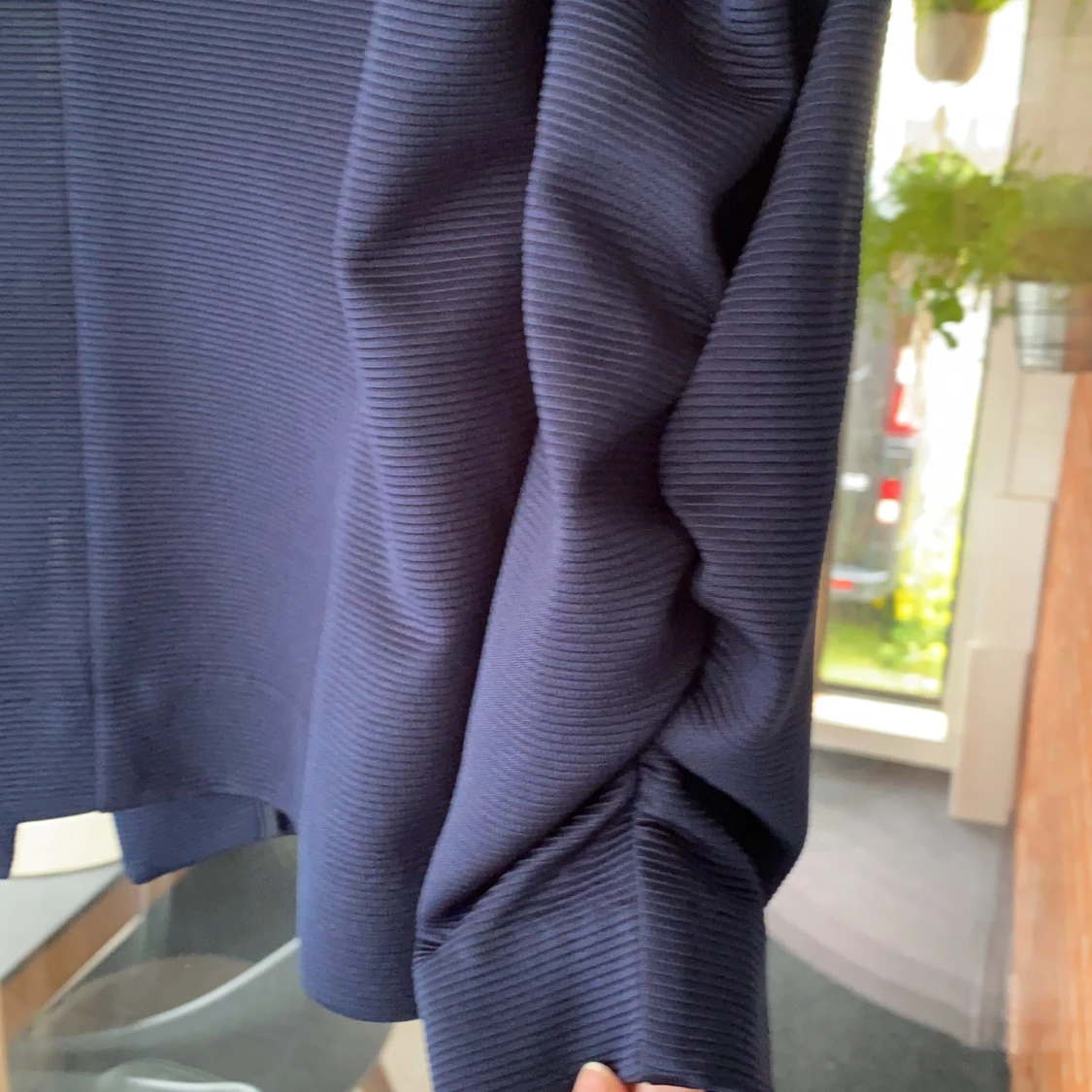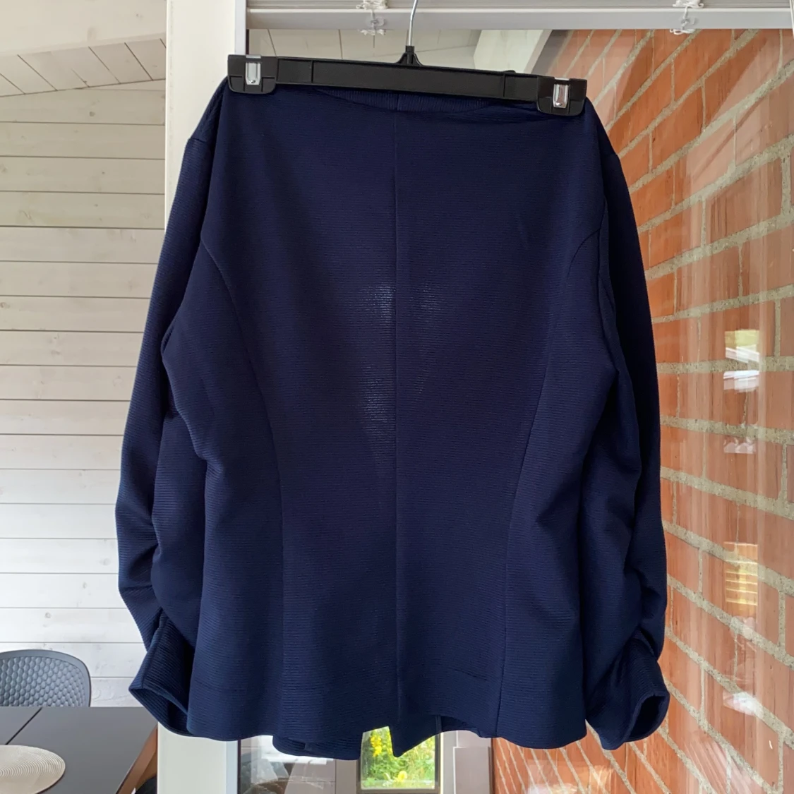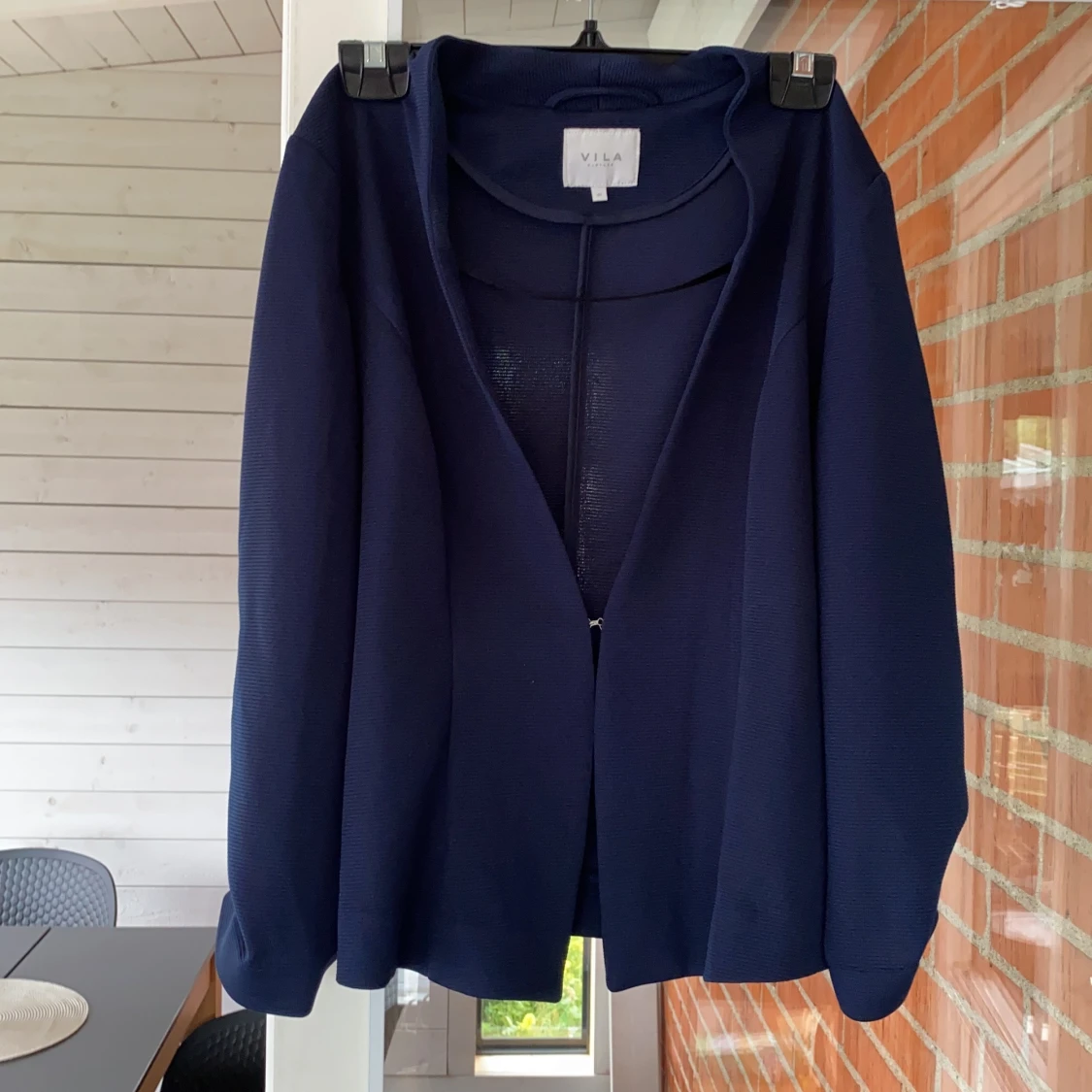 En figursydd kavaj från Vila i marinblå med ett litet knäppe i mitten samt med uppsydda ärmar. Kavajen är i fint skick. Frakten är inräknad i priset.