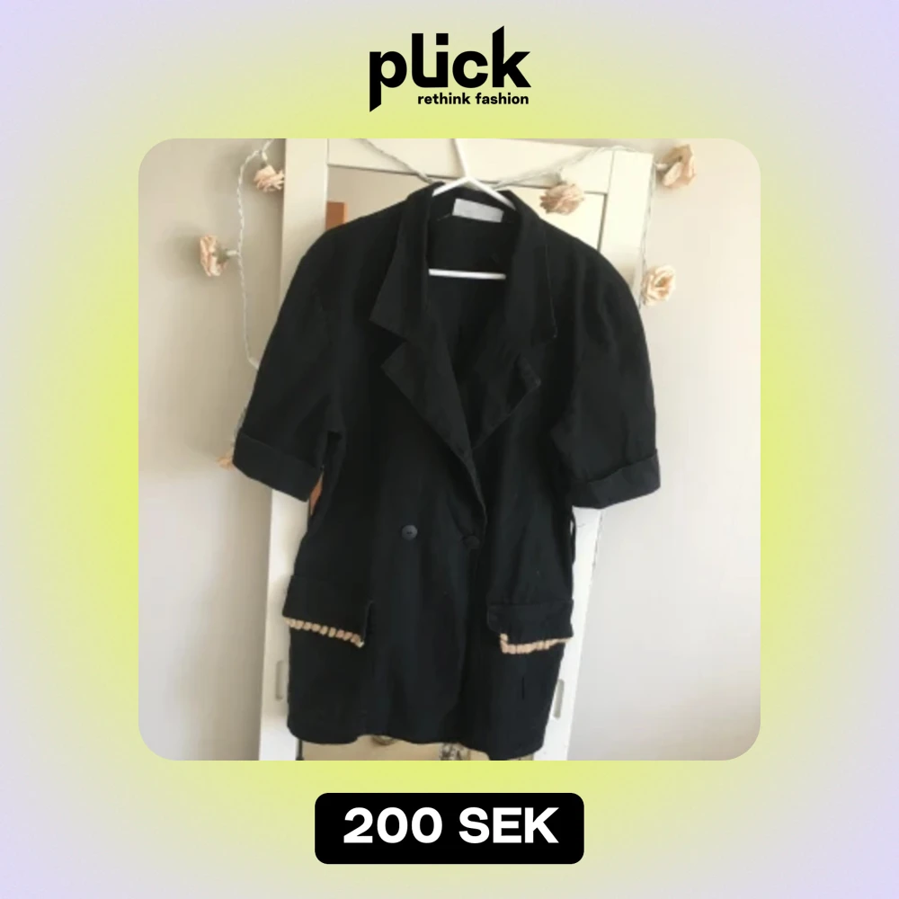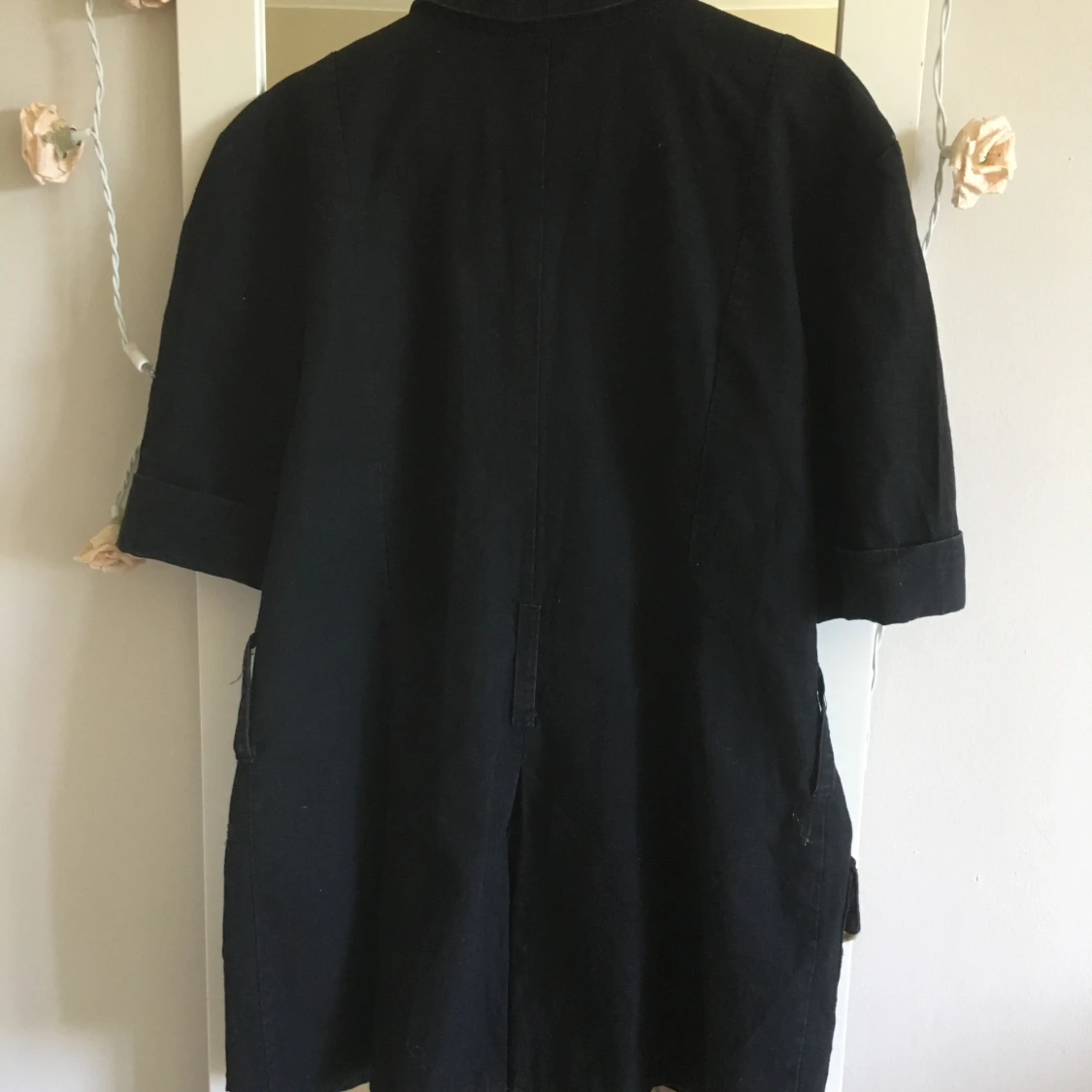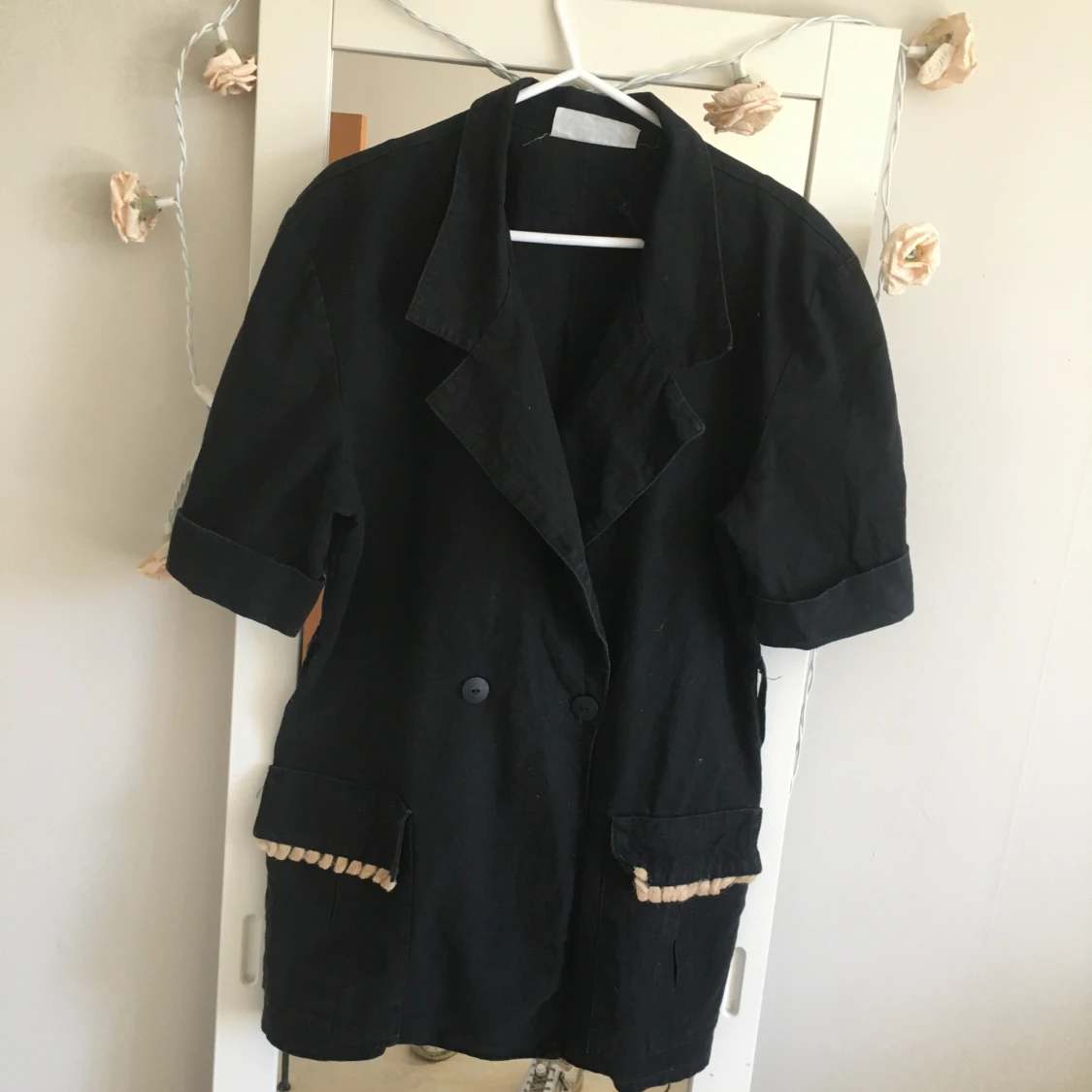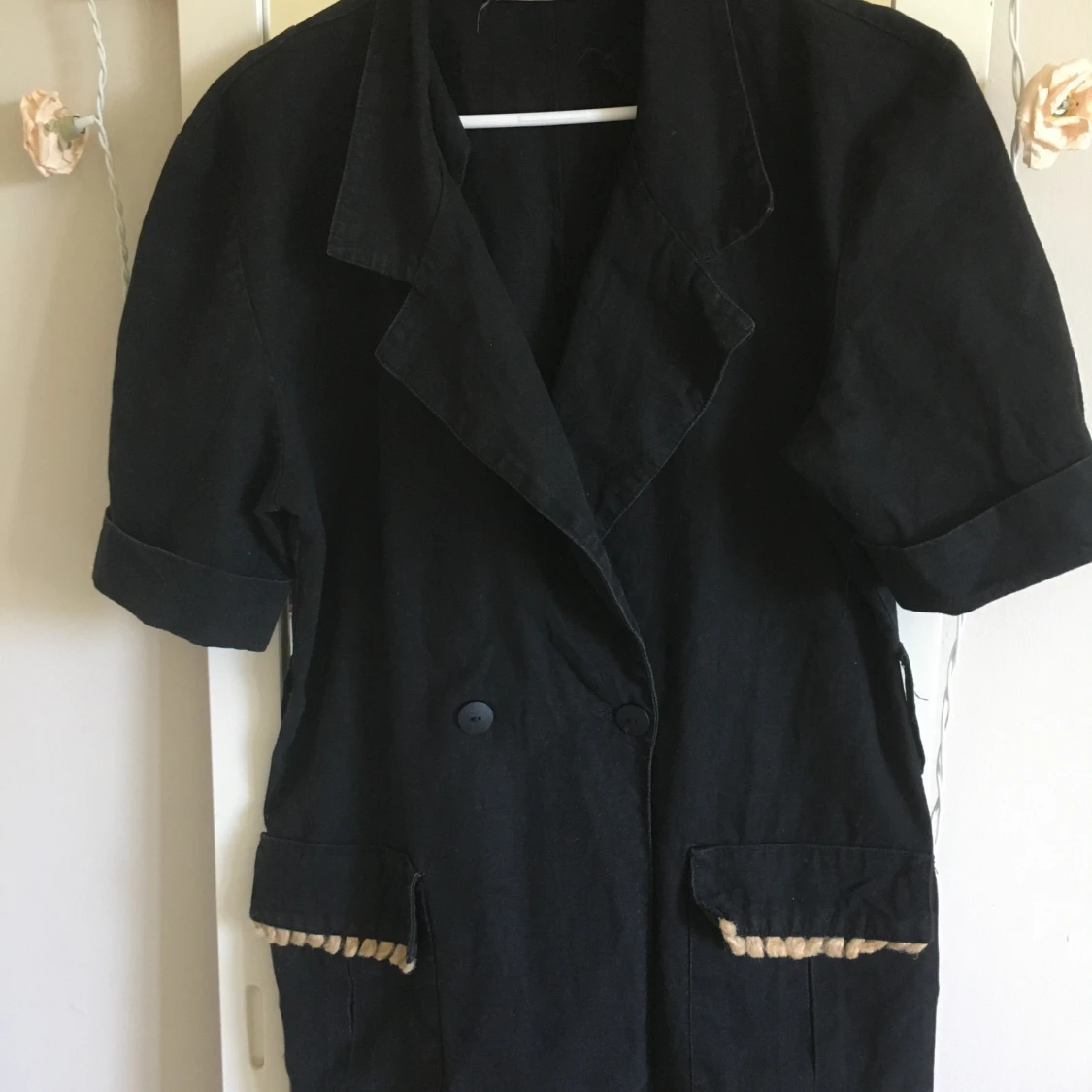 Vintage 90-talet kort arm kavaj . Bälte följer med .har två stora djupa fickor .storlek är stor medium eller Lars passar också . Längd ca 74cm Skriv gärna om ni vill exat mått