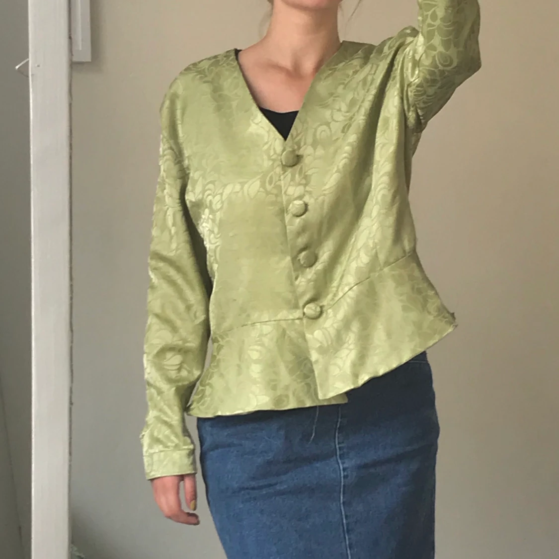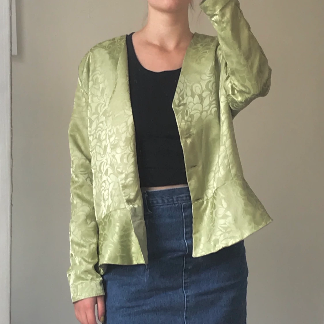 Ljusgrön vintage kavaj med fint mönster. Liten volang i nederkanten och klädda knappar. Frakt tillkommer. Möts på södermalm 💞💞💞
