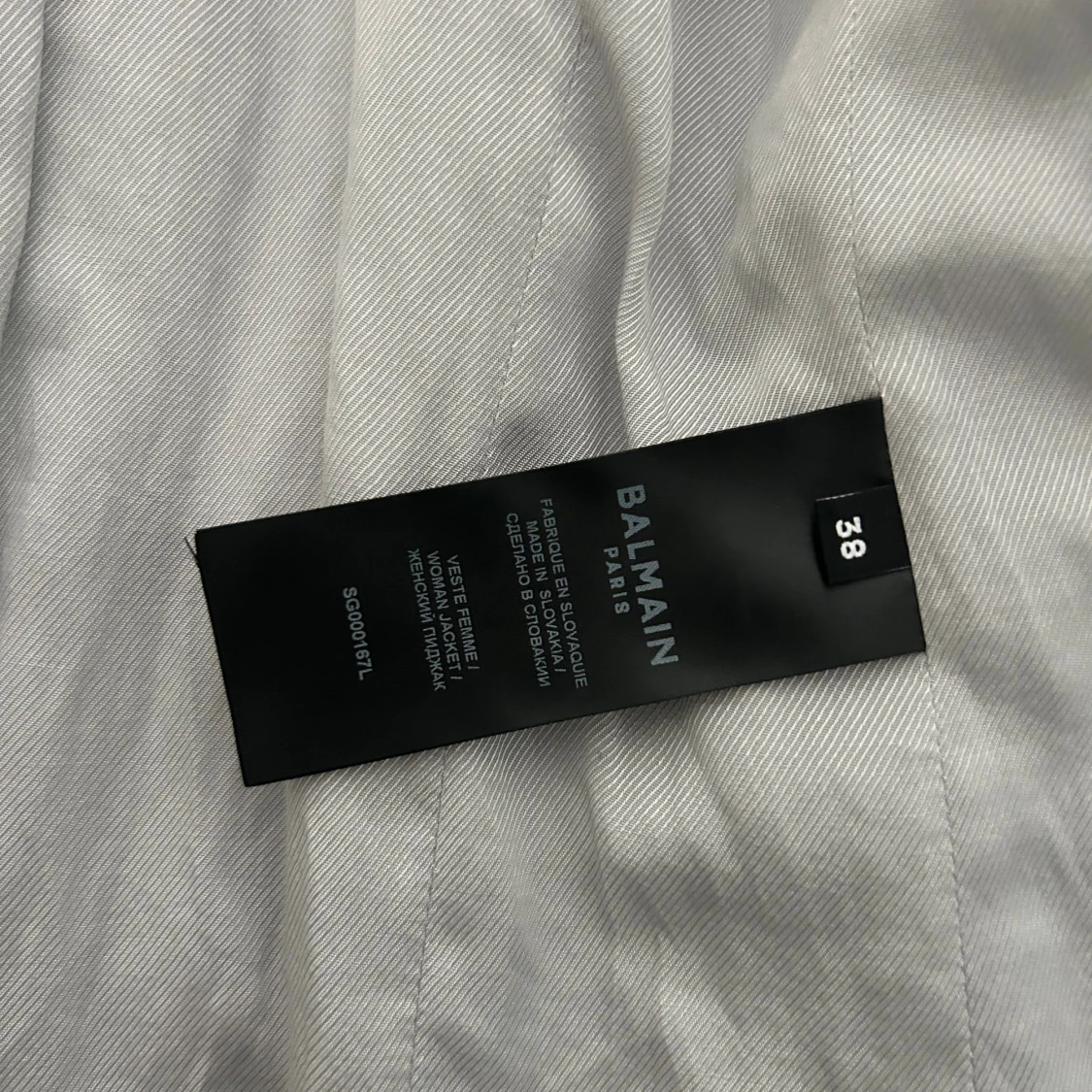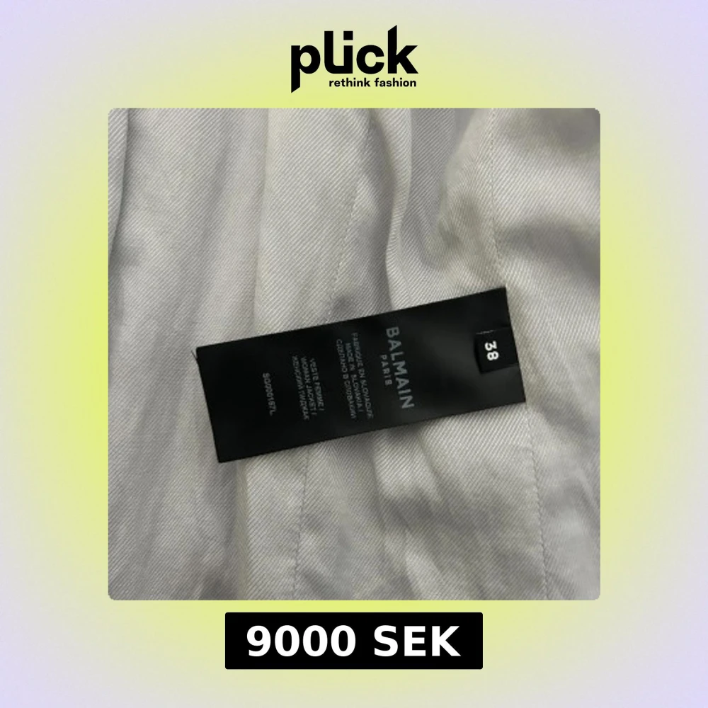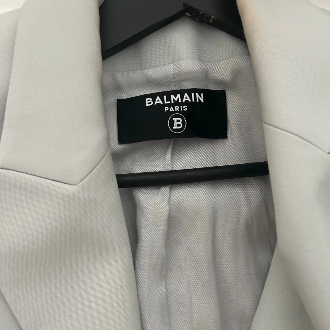 Snygg vit kavaj från Balmain Paris i storlek 38. Kavajen har markerade axlar, klassisk krage och sex guldiga knappar vid ärmslutet. Fickor med lock och figurnära passform ger en stilren look. Perfekt för dig som vill ha en exklusiv vibe.