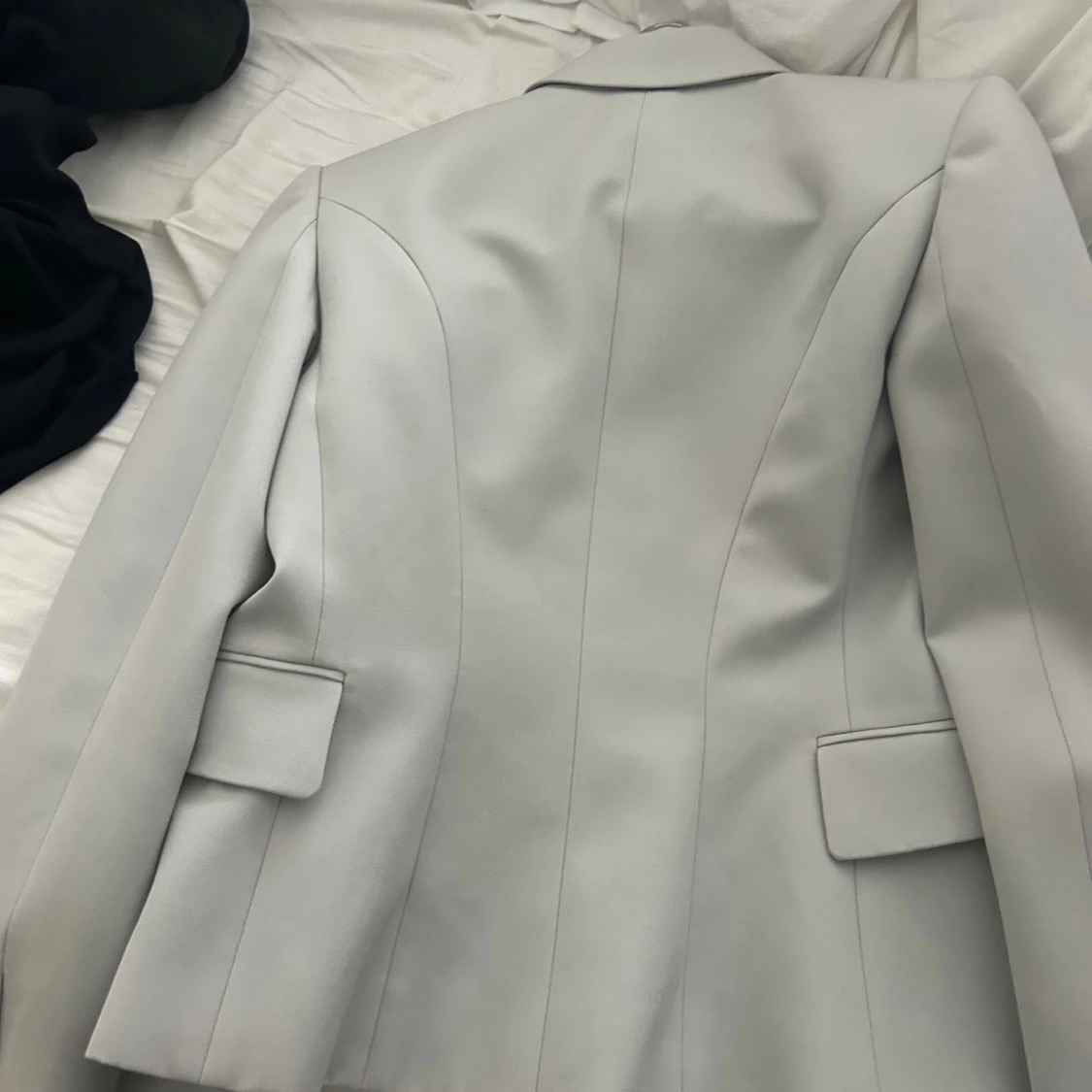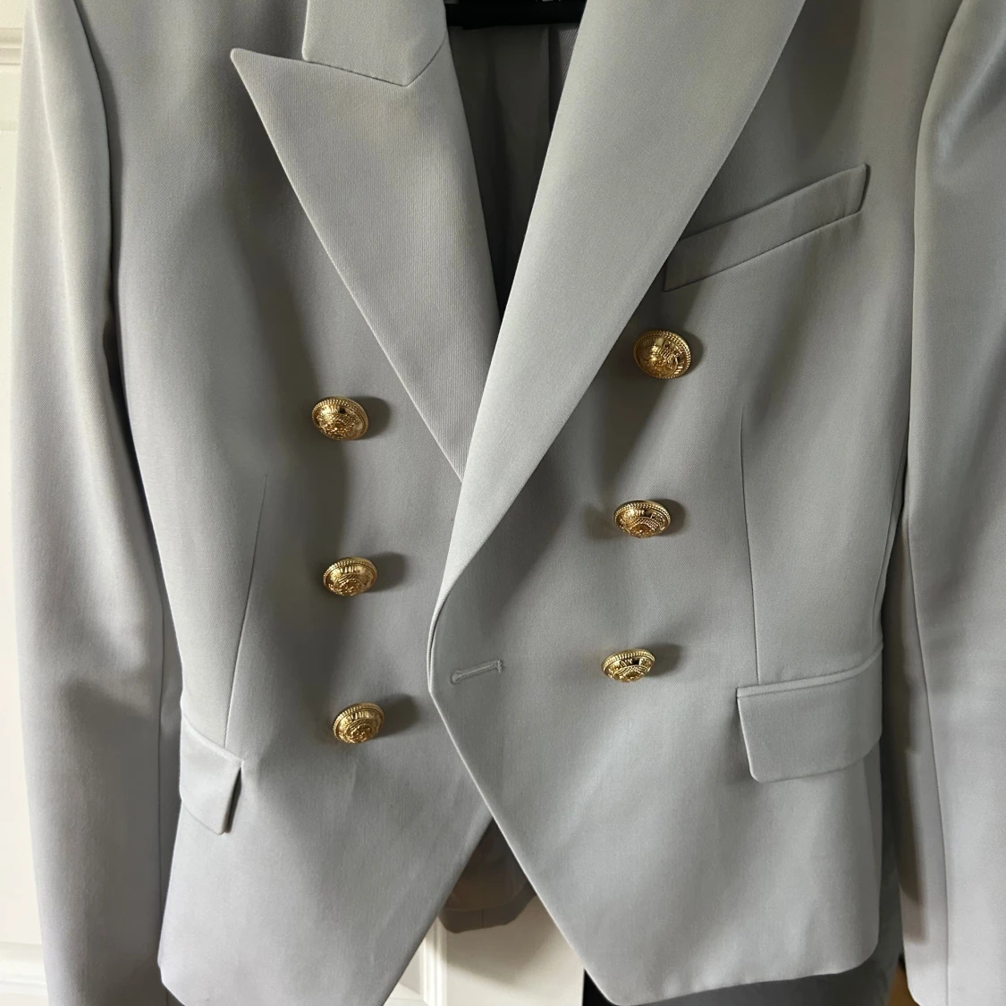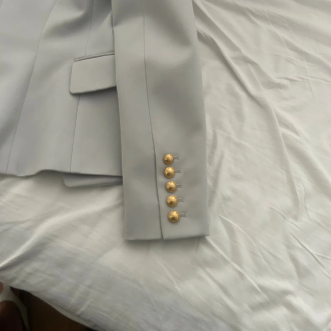 Snygg vit kavaj från Balmain Paris i storlek 38. Kavajen har markerade axlar, klassisk krage och sex guldiga knappar vid ärmslutet. Fickor med lock och figurnära passform ger en stilren look. Perfekt för dig som vill ha en exklusiv vibe.