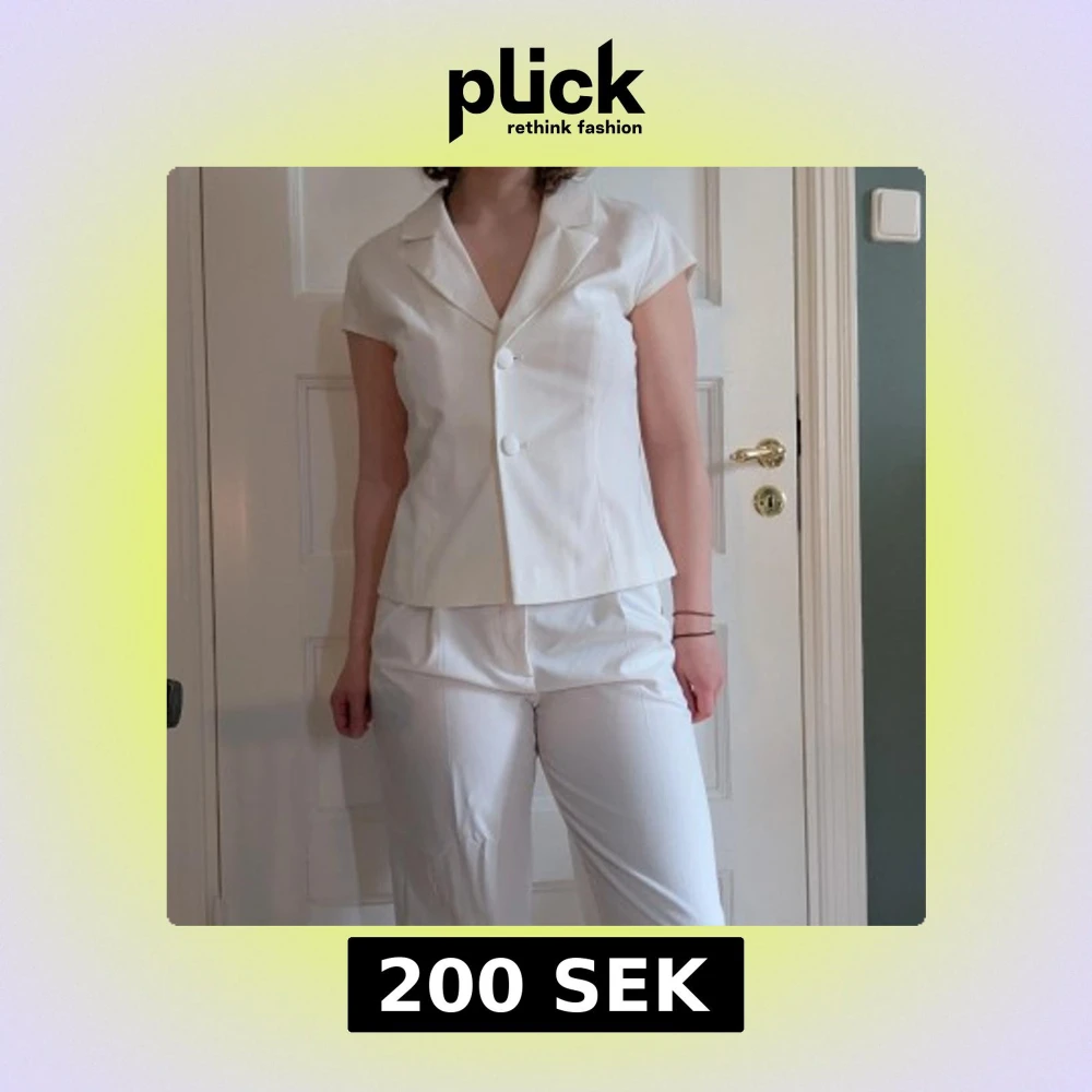 Vit kavaj med korta ärmar och två knappar framtill, matchad med vita kostymbyxor. Perfekt till studenten om man vill ha något annat än klänning, hade själv detta på min studentmottagning ☺️. Överdelen är strl 40 och byxorna strl 36