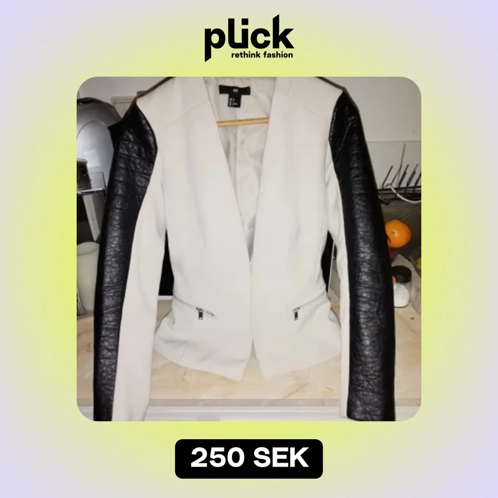 Säljer en snygg vit och svart jacka från H&M. Den har en cool design med vita paneler och svarta skinnärmar. Jackan har dragkedjor framtill och en stilren look. Perfekt för både vardag och fest!