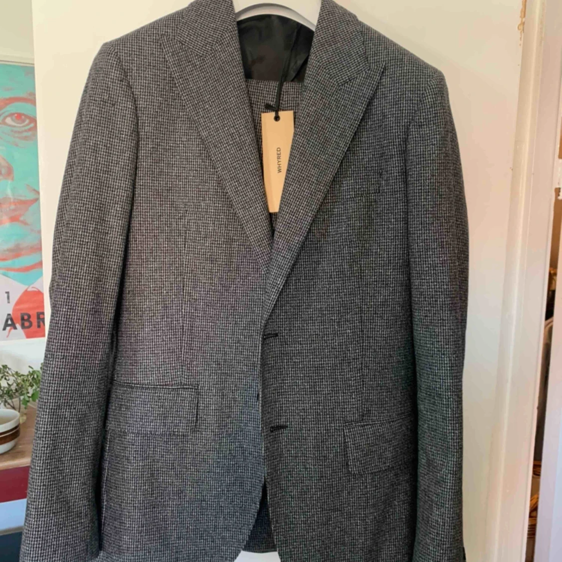 Kostym i nyskick från Whyred kavajen endast använd 1 gång. Spetsiga slag och en blandning med ull och silke och polyamid i tyget