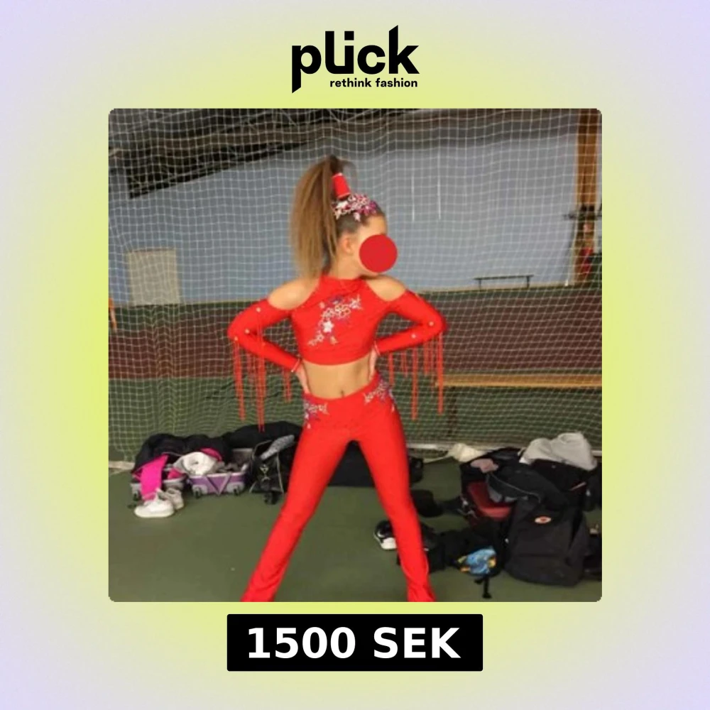 Säljer en riktigt snygg röd danskostym med långa ärmar och axelcutouts. Toppen är croppad och har glittriga paljettdetaljer och fransar längs ärmarna. Byxorna är höga och utsvängda med matchande dekorationer. Perfekt för dans eller en tävling!