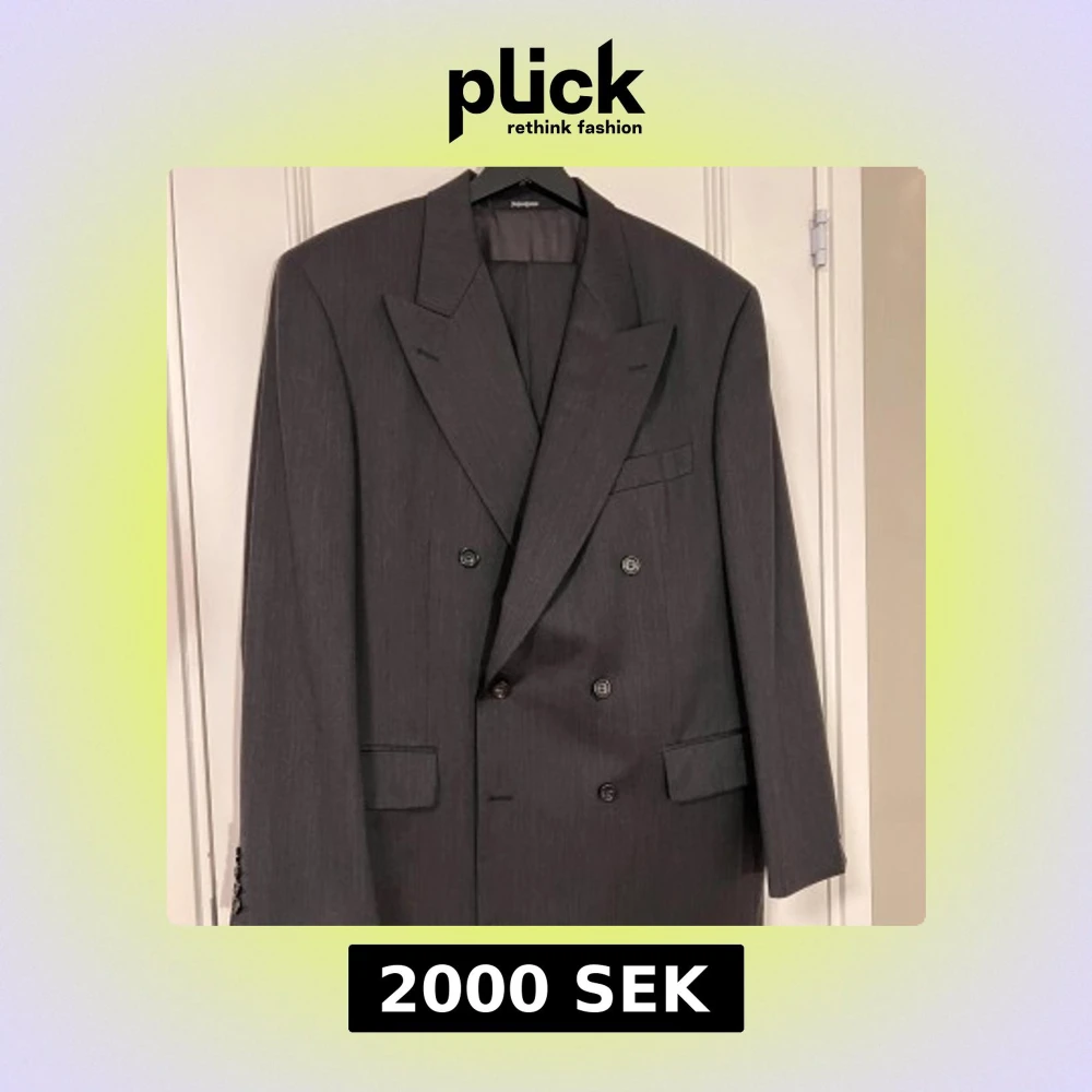 Dubbelknäppt grå kostym från Yves Saint Laurent. Kavajen har breda slag, fyra fickor och klassiska knappar. Byxorna är raka med pressveck och uppvikta benslut. Kostymen är i en mörkgrå nyans (charcoal grey) och har en elegant, tidlös design. Vid mer information är det bara att fråga.