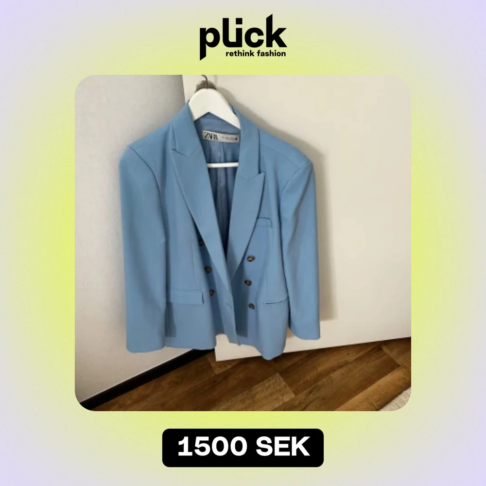 En elegant ljusblå kavaj och matchande byxor från Zara. Kavajen har en klassisk design med två rader av knappar och fickor framtill. Byxorna är raka och har en hög midja.