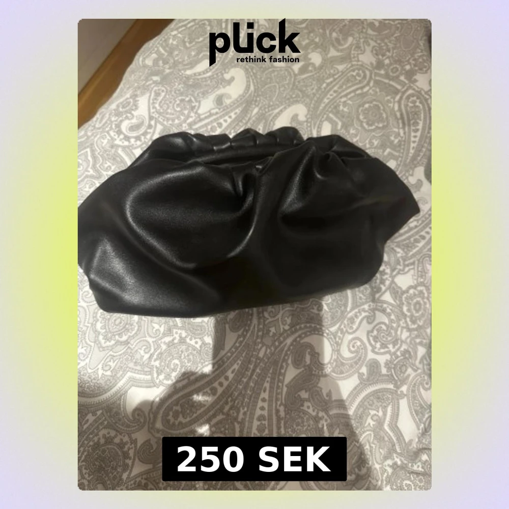 Säljer en svart kuvertväska i mjukt fejkläder med puffig, veckad design. Väskan har en modern och trendig look med rundad form och stängs upptill. Perfekt för dig som vill ha en stilren accessoar till din outfit.