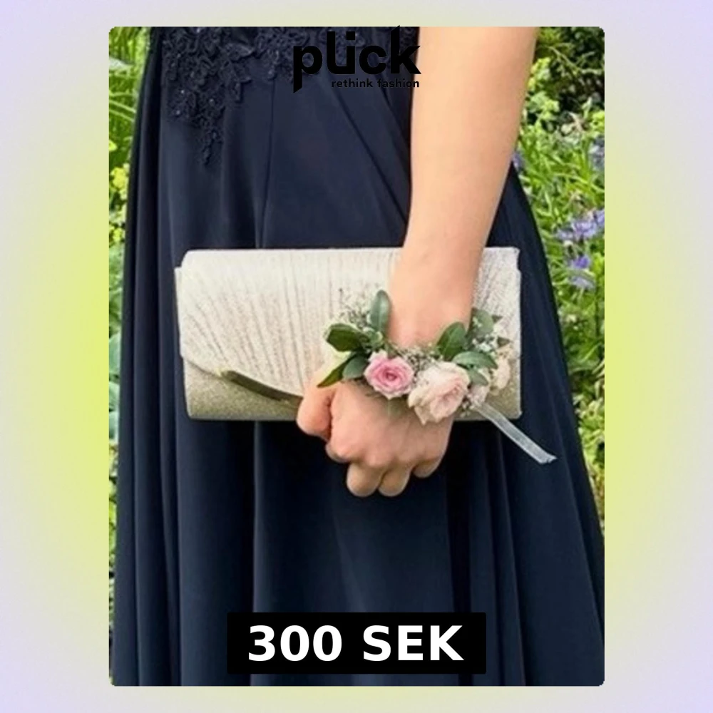 Säljer en elegant kuvertväska i glittrigt beige tyg. Perfekt för bal.
