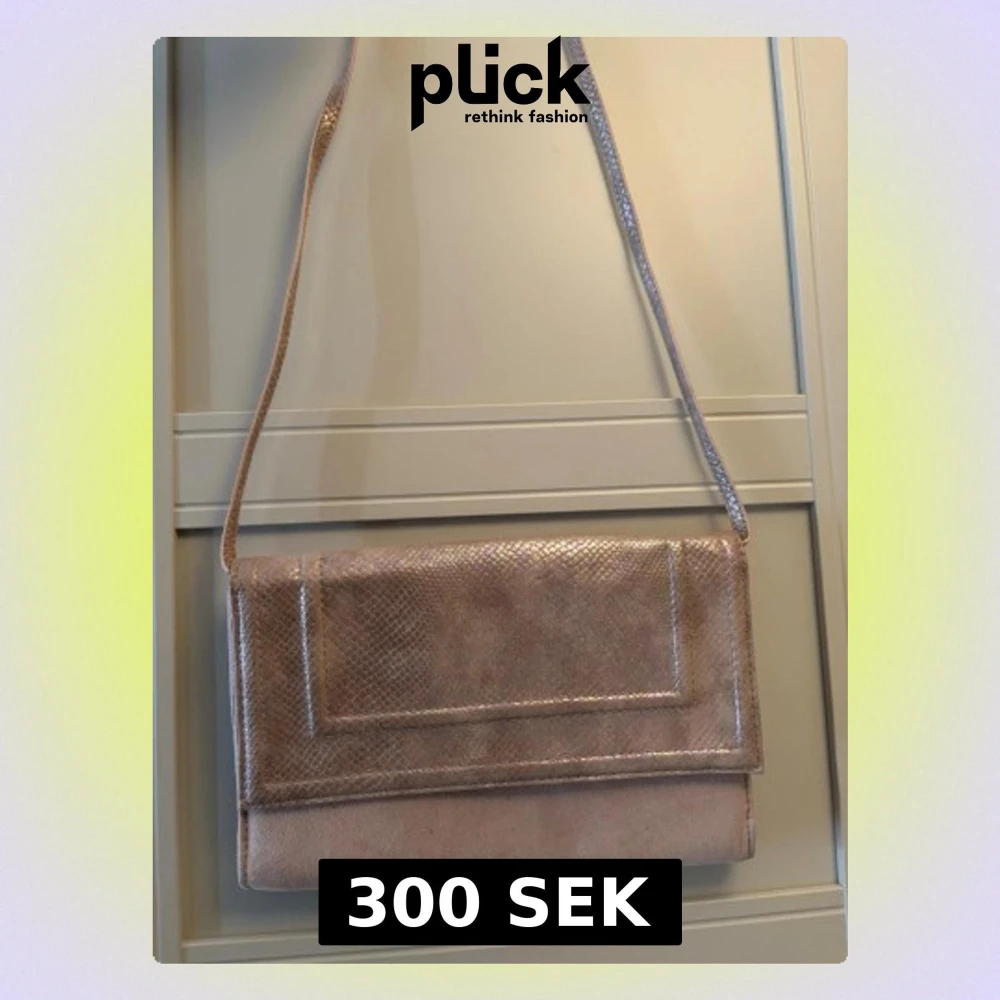 Säljer en snygg rosa kuvertväska med axelrem. Väskan har en skimrande yta med ormmönstrad struktur på locket och remmen, medan resten är i mjuk mockaliknande material. Perfekt för dig som vill ha en stilren och trendig accessoar.