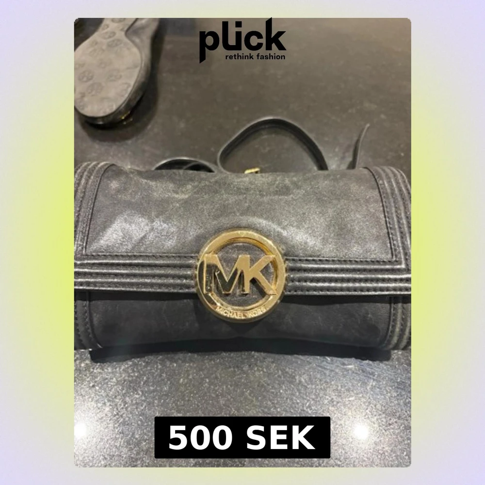 Snygg svart kuvertväska från Michael Kors med stort guldfärgat MK-emblem framtill. Väskan är i läderimitation och har ett stilrent, klassiskt utseende med magnetlås och innerfack med dragkedja. Perfekt för att lyfta din outfit.