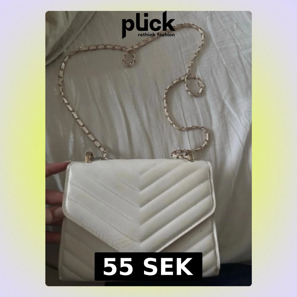 Snygg vit kuvertväska med quiltat mönster och guldfärgad kedjerem. Väskan har ett kuvertlock och är tillverkad i ett glansigt material. Säljer då den int ekonomer till användning längre.