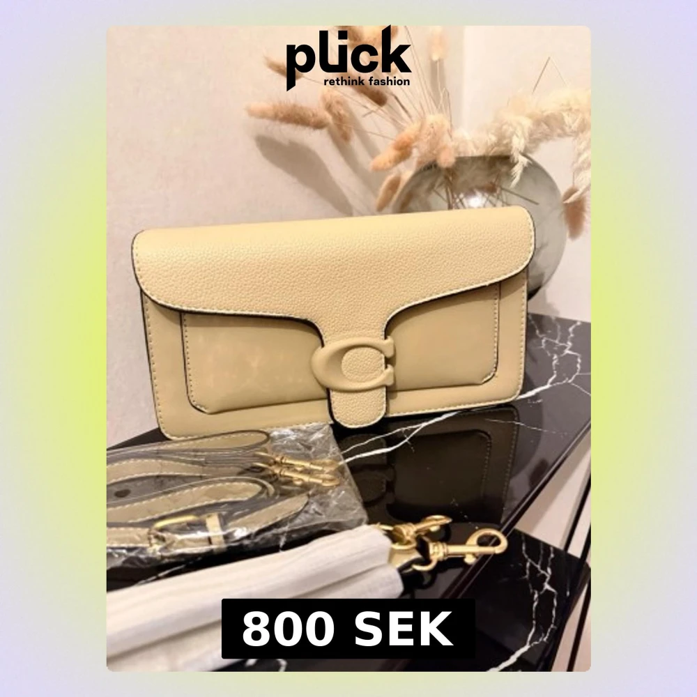 Stilren beige kuvertväska från Coach i skinn med klassisk C-detalj på locket. Väskan har avtagbar axelrem i matchande färg och guldfärgade metalldetaljer. Insidan har ett fack med dragkedja för småsaker. Perfekt för att lyfta din outfit.