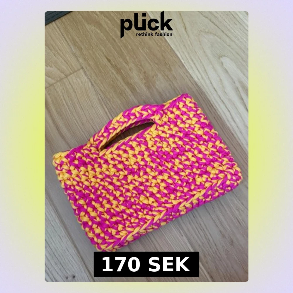 Unik handvirkad kuvertväska i starka färger, mixad i rosa och gul. Väskan har inbyggt handtag och är gjord av tjockt garn som ger en cool och trendig look. Perfekt accessoar för dig som vill sticka ut och addera färg till din outfit.