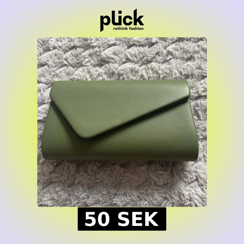 Stilren olivgrön kuvertväska med asymmetrisk lockdesign. Väskan är gjord i slät skinnimitation och har en minimalistisk look utan synliga detaljer eller logga. Perfekt för dig som gillar enkel och modern stil.