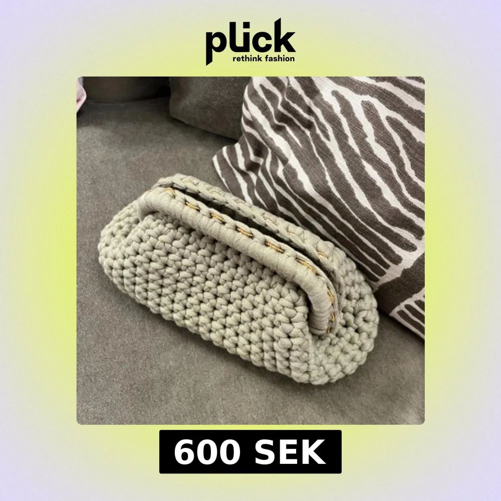 Unik handvirkad kuvertväska i grönt tjockt garn med mjuk struktur. Väskan har en stadig ram upptill och detaljer i guld. Perfekt för dig som gillar personliga accessoarer. Kan användas som både necessär och clutch/kuvertväska. Så fin inför sommarens alla tillfällen☺️