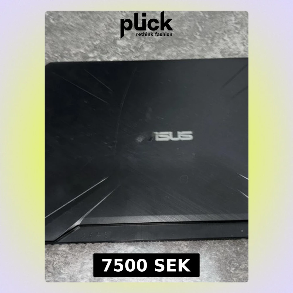 Säljer en svart ASUS TUF Gaming bärbar dator med stilren design och markerade linjer på locket. Tangentbordet har vita WASD-tangenter och datorn har AMD Ryzen-märke. Perfekt för gaming och studier, med robust plastchassi och stor skärm.