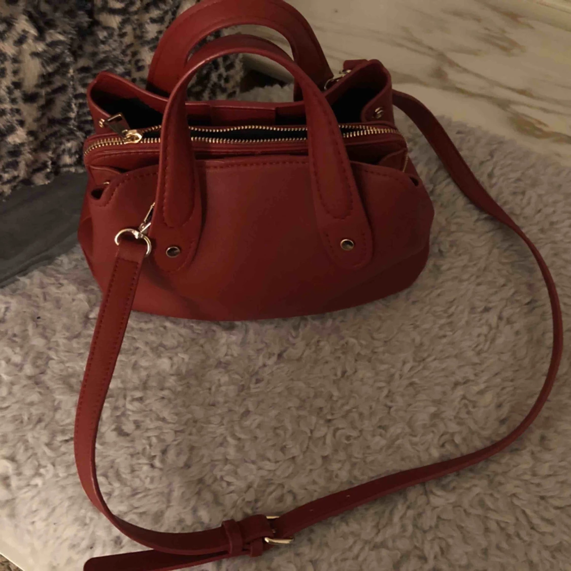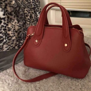 Assnygg väska i mörkröd färg. Finns plats för tex ä en liten dator eller idrottskläder. Avtagbart längre band ingår.