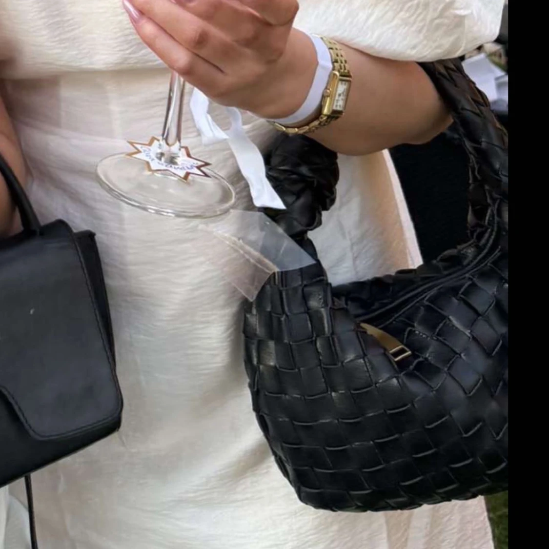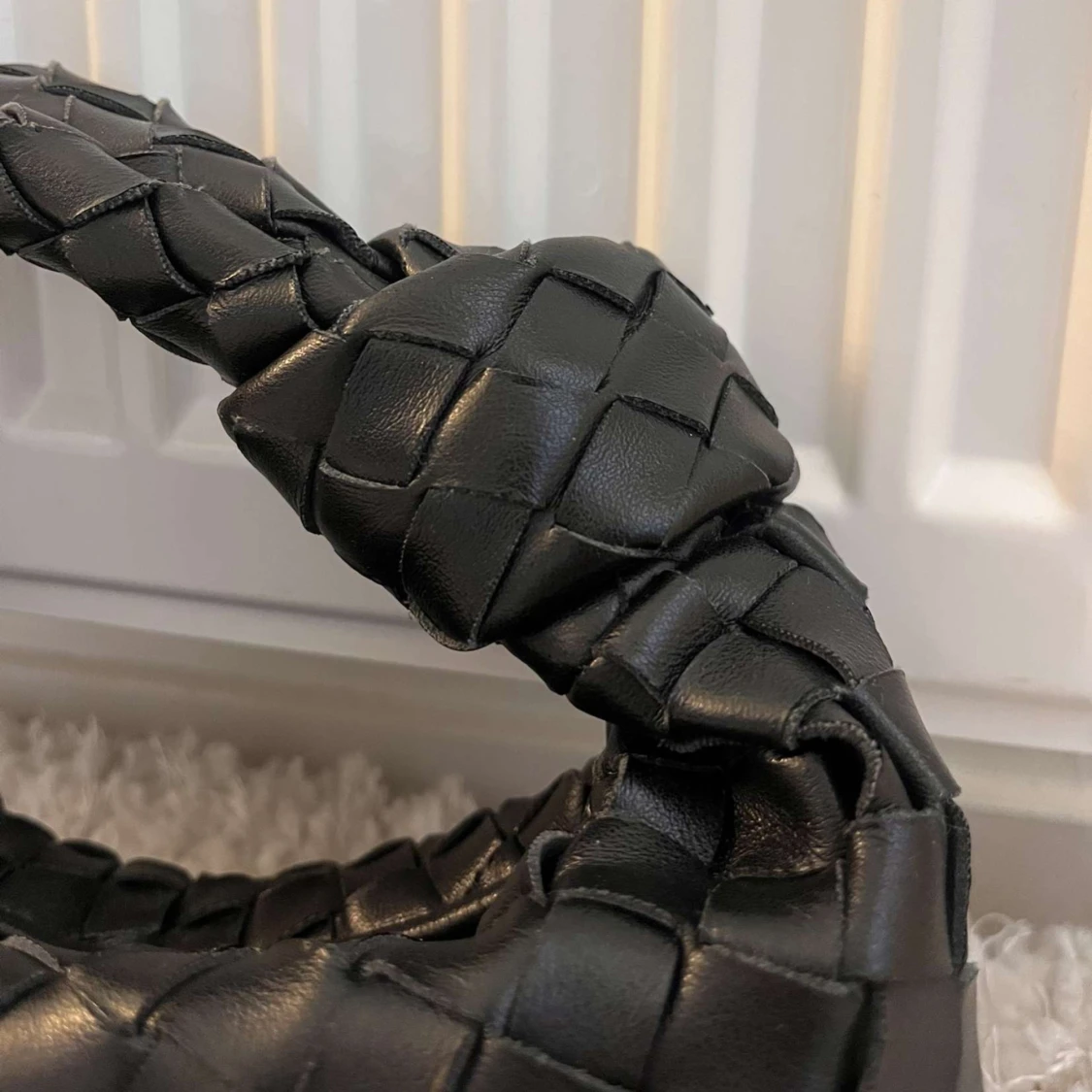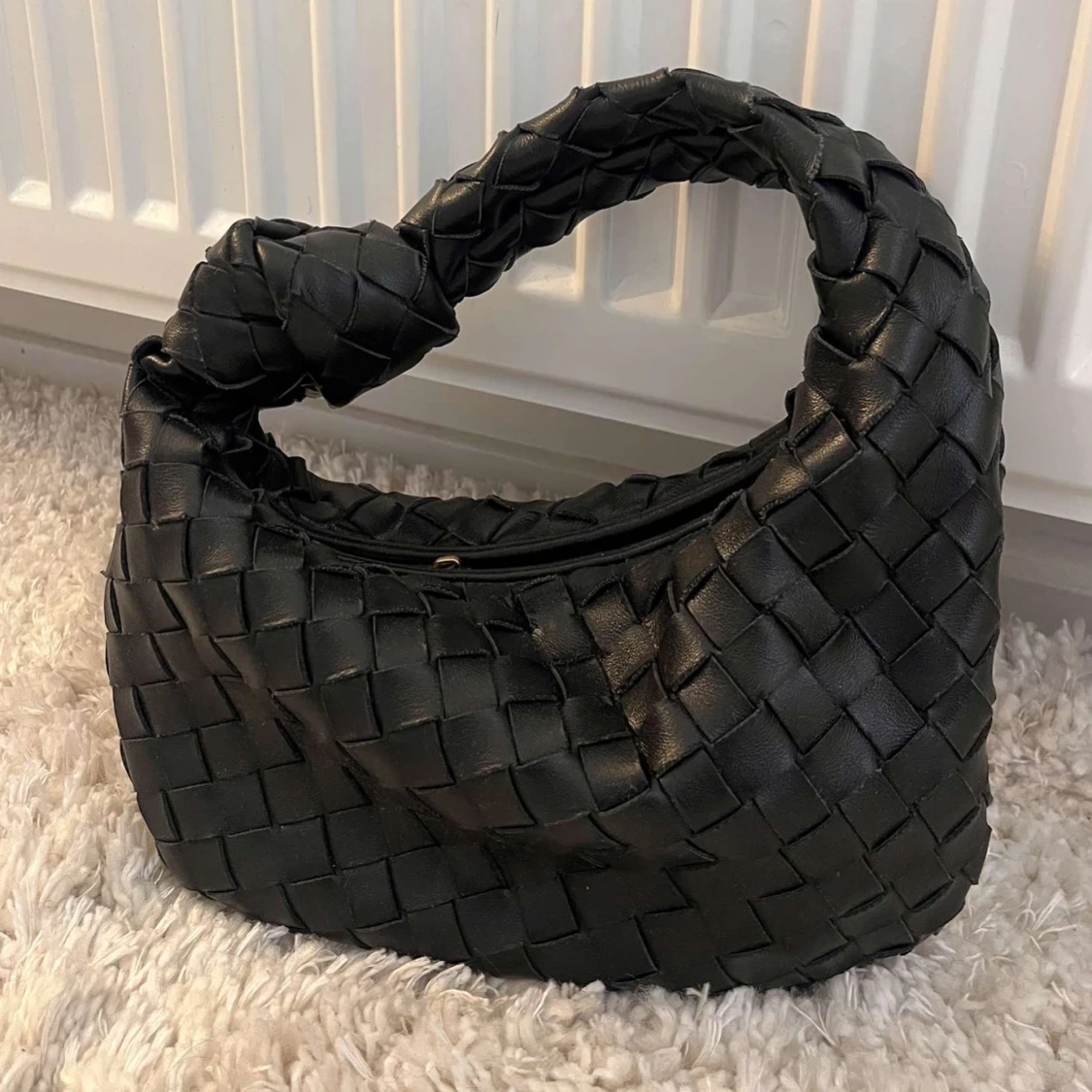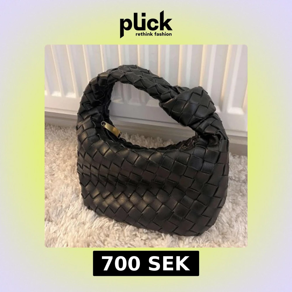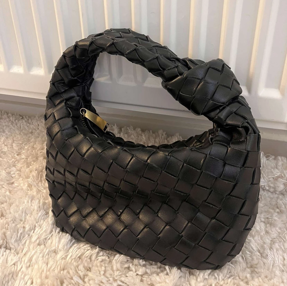 Trendig svart handväska med flätad design och knutdetalj på handtaget. Liknar Bottega och är i bra skick💞