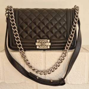 Svart väska liknande chanel. Liten spricka uppe på sidan av väskan upptill, inget som direkt syns eller störs utav. Kolla bild.