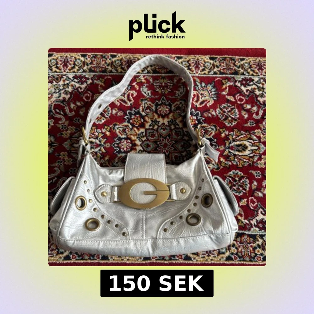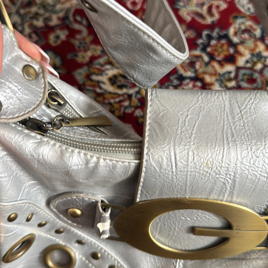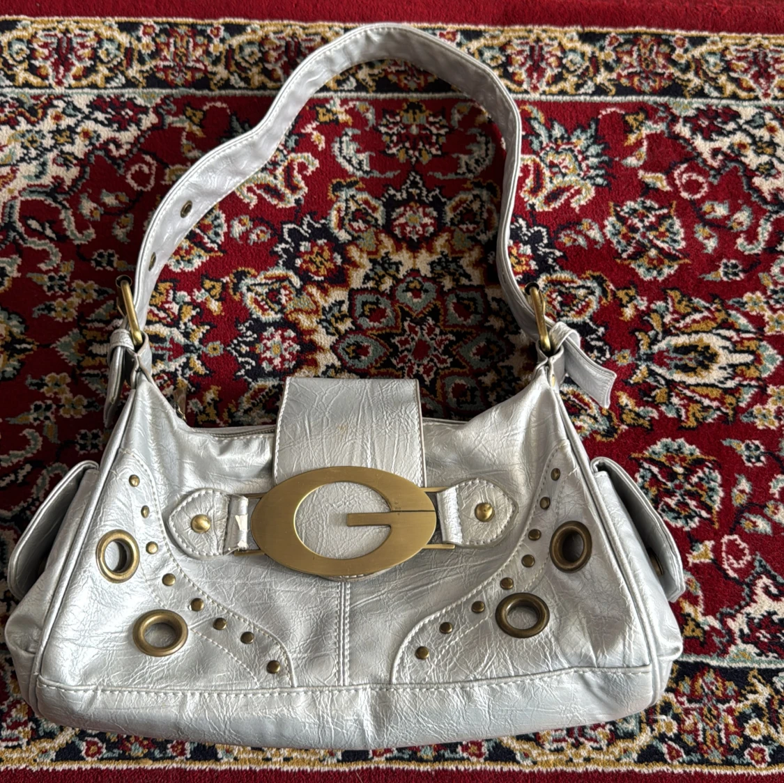 Cool silvrig axelväska som liknar Guess med stort G-spänne i guldmetall framtill. Väskan har bred axelrem, dragkedja och flera runda metalldetaljer