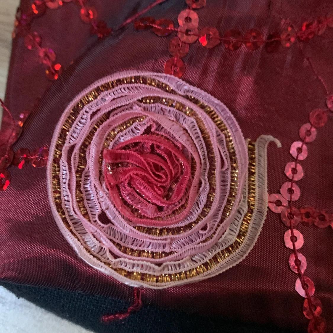 Gullig liten handväska med handbroderade blommor och paljetter. Stängs med en träknapp. Handtaget är prytt med gulligt snöre och trapärlor. Väskan har en strukturerad botten och är 100% bomull.