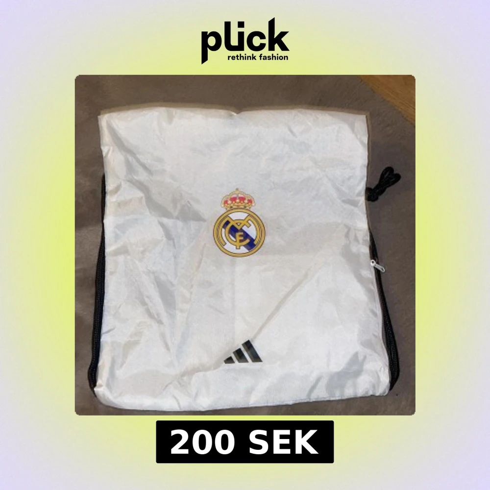 Säljer en vit gympåse med Real Madrid-logga och Adidas-märke. Påsen har snörning i svart och en dragkedja på sidan för extra förvaring. Köpt i spanien i real madrids affär. Knappt använd