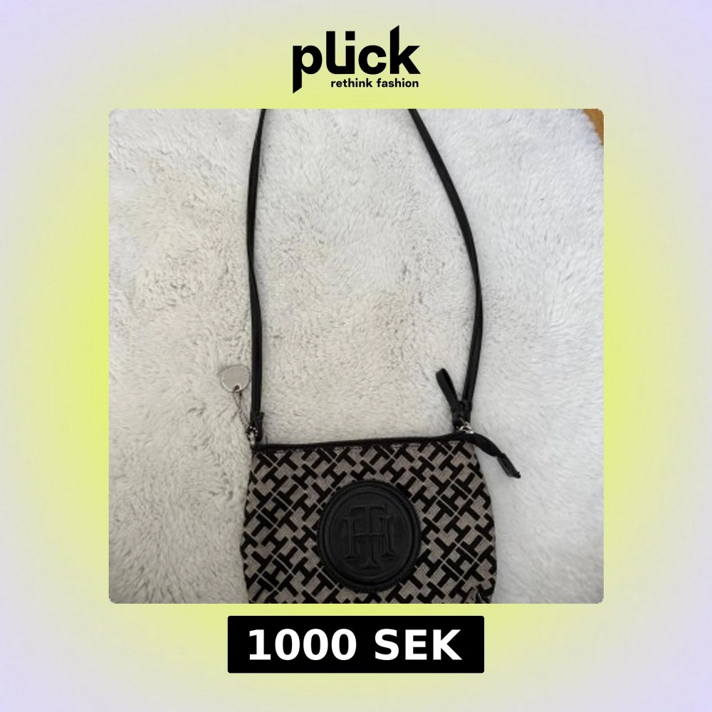 Snygg äkta vintage axelväska från Tommy Hilfiger med svart och beige mönster, rund TH-logga framtill och silverfärgad tag. Väskan har justerbar axelrem, dragkedja och innerfack. Perfekt storlek för det viktigaste och en stilren detalj till din outfit.